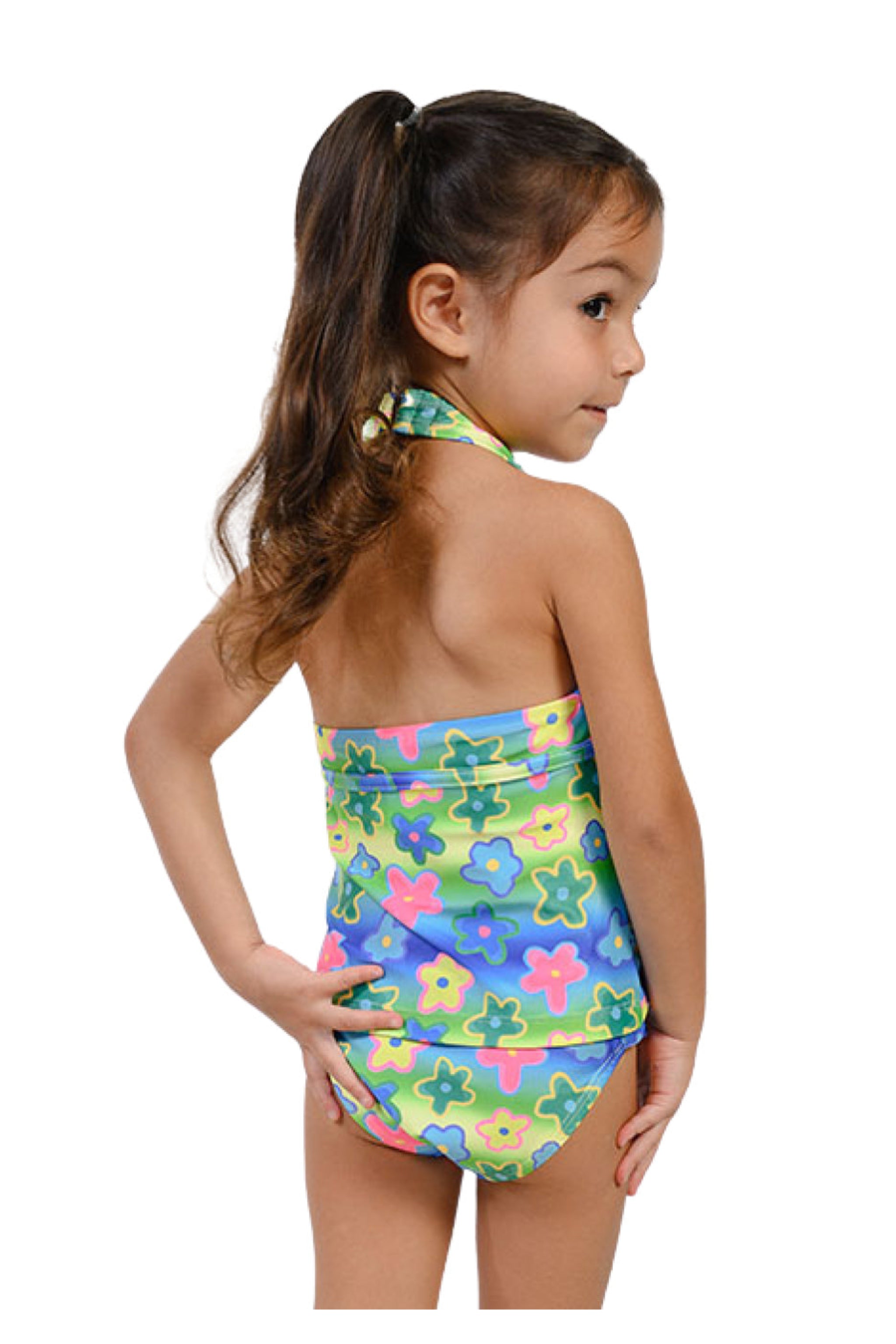 Traje de baño de dos piezas tipo tankini con volantes escalonados y parte inferior con cintura lateral para niñas pequeñas