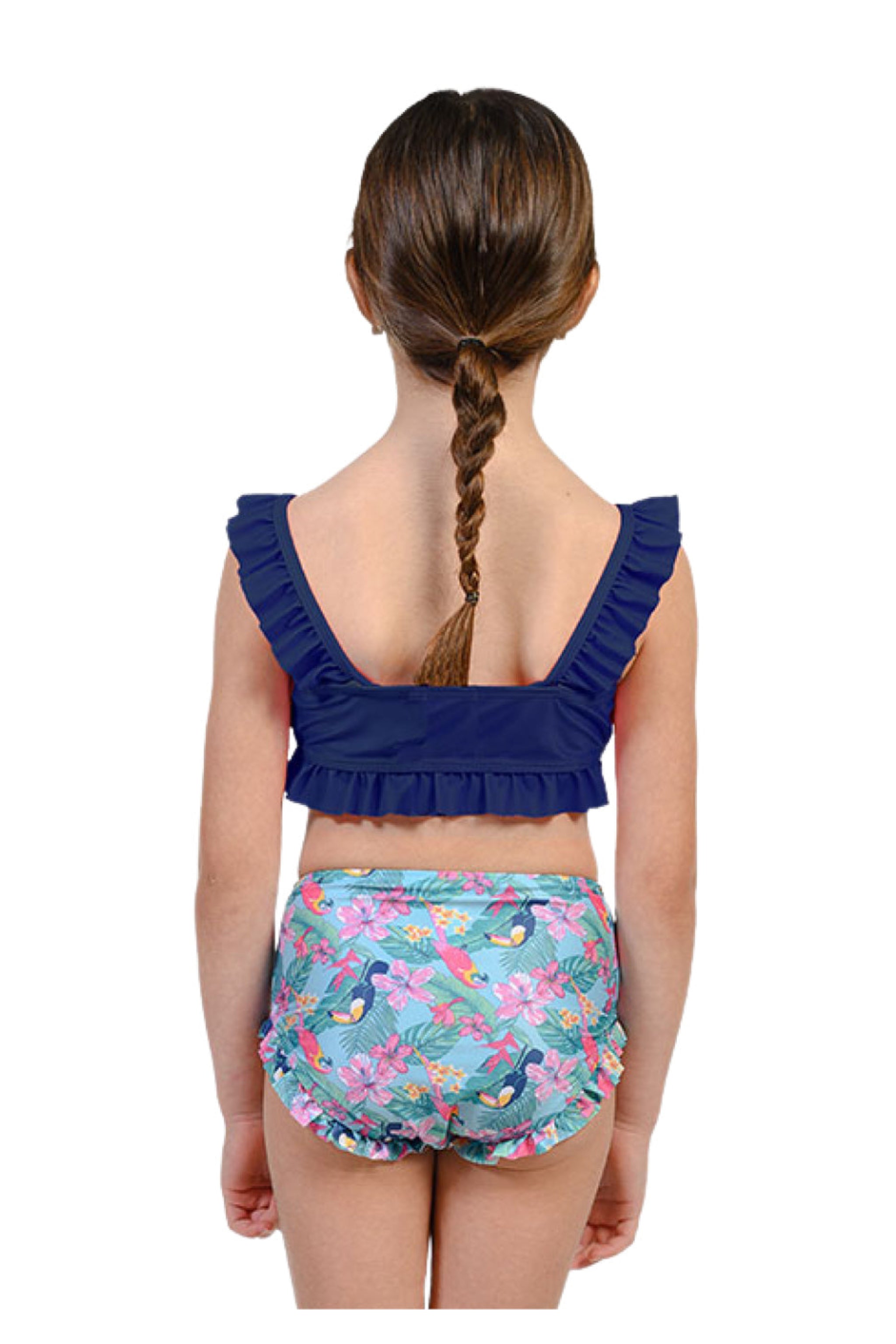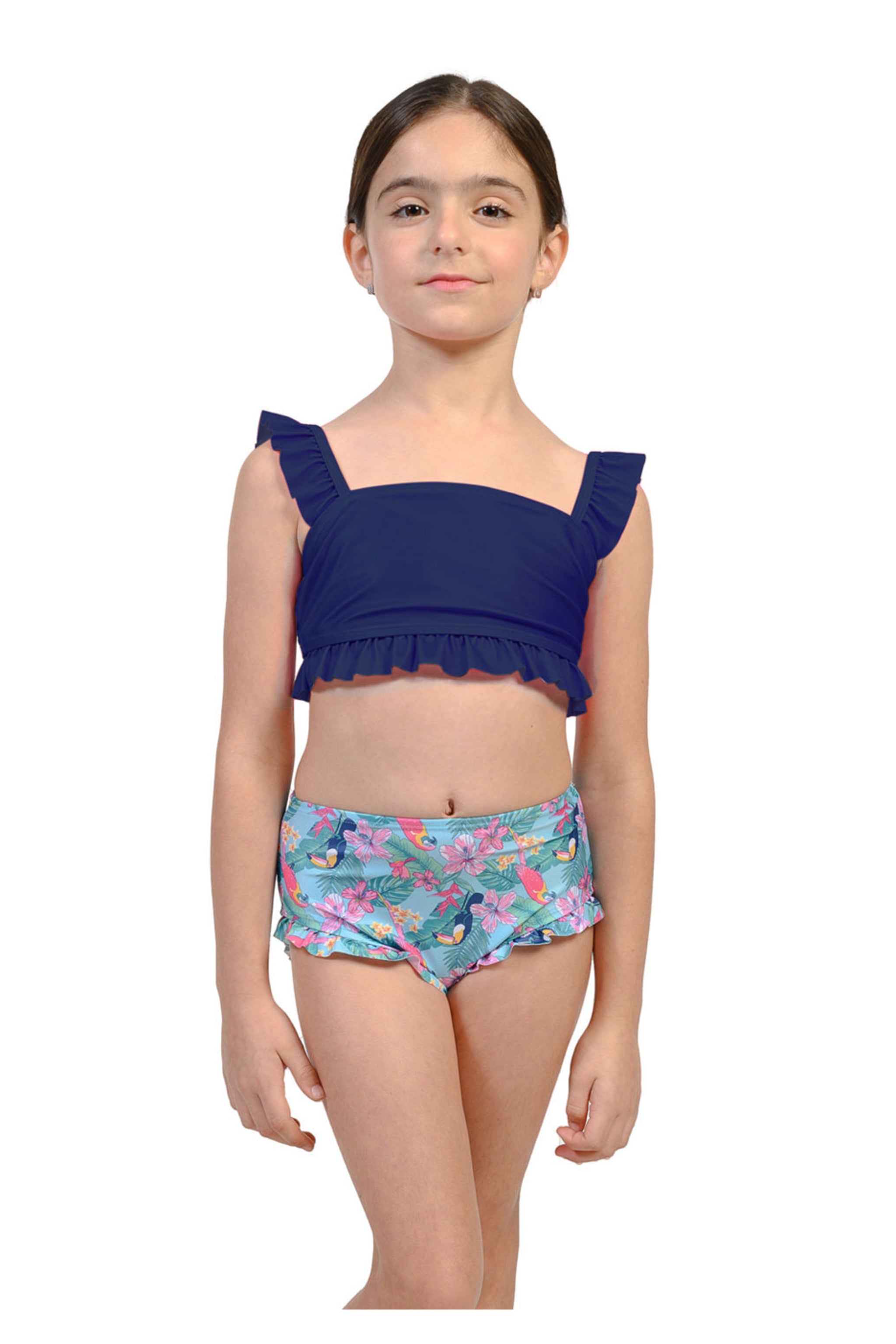 Traje de baño bikini de dos piezas de cintura alta con volantes en la parte superior e inferior para niñas