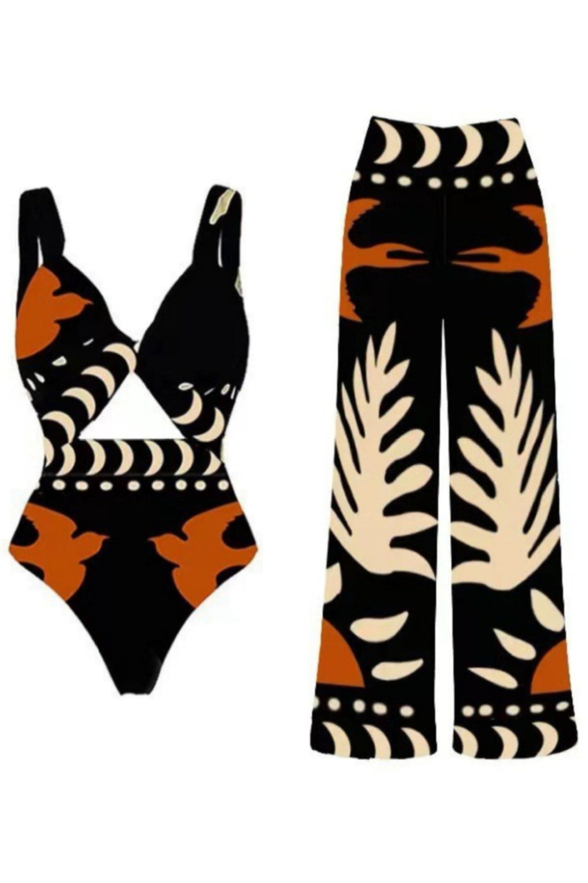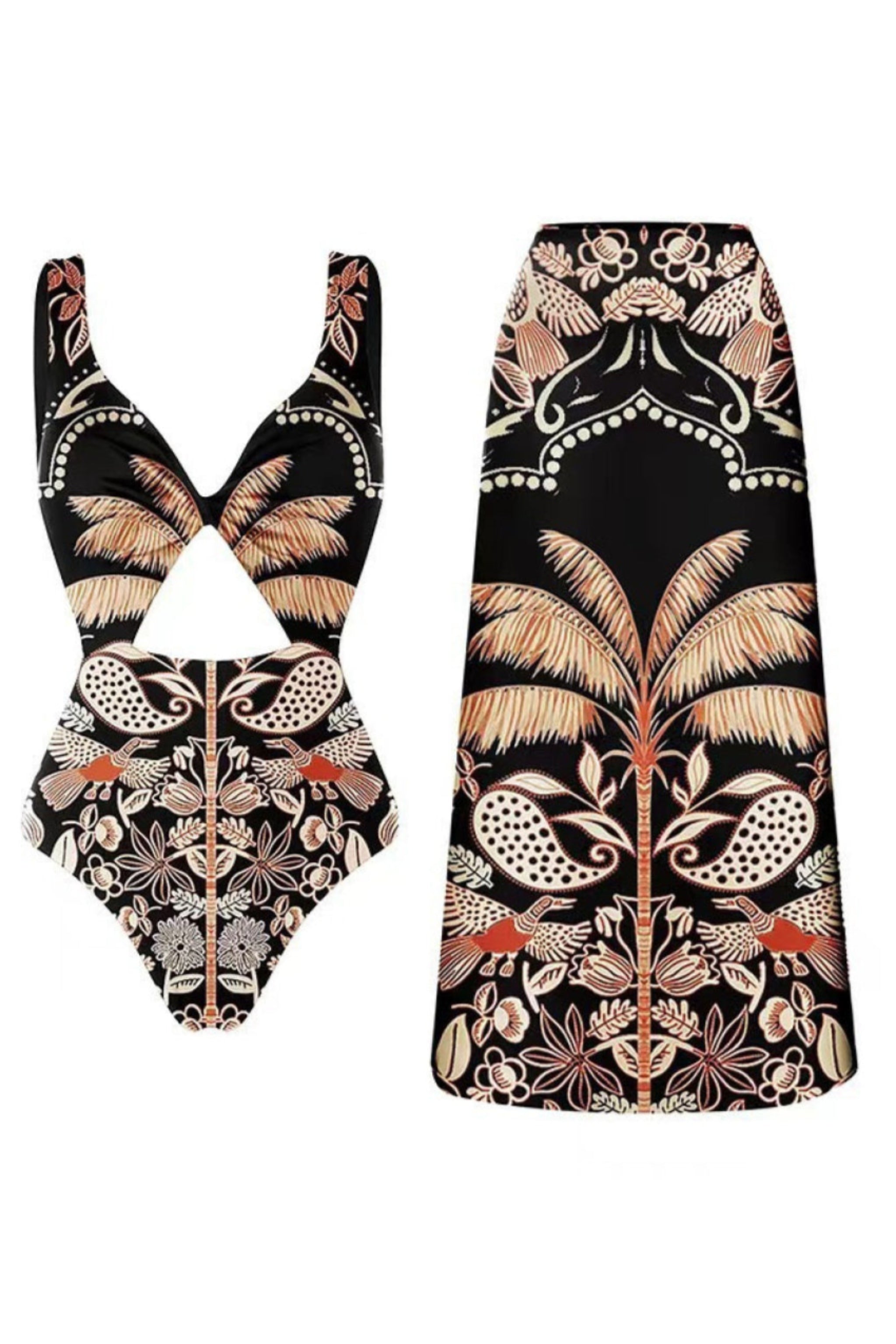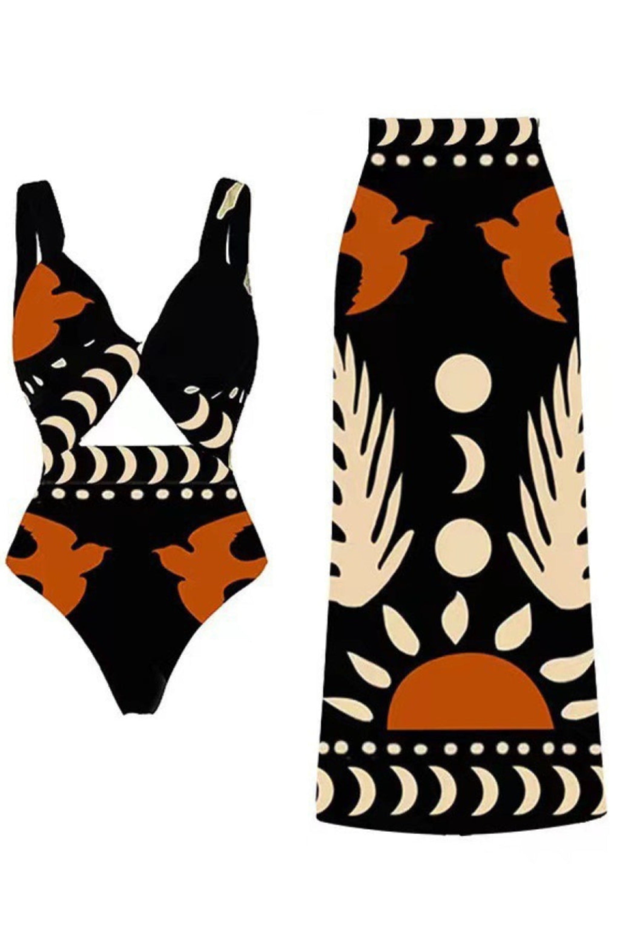 Traje de baño de una pieza con estampado tribal con falda y pantalón