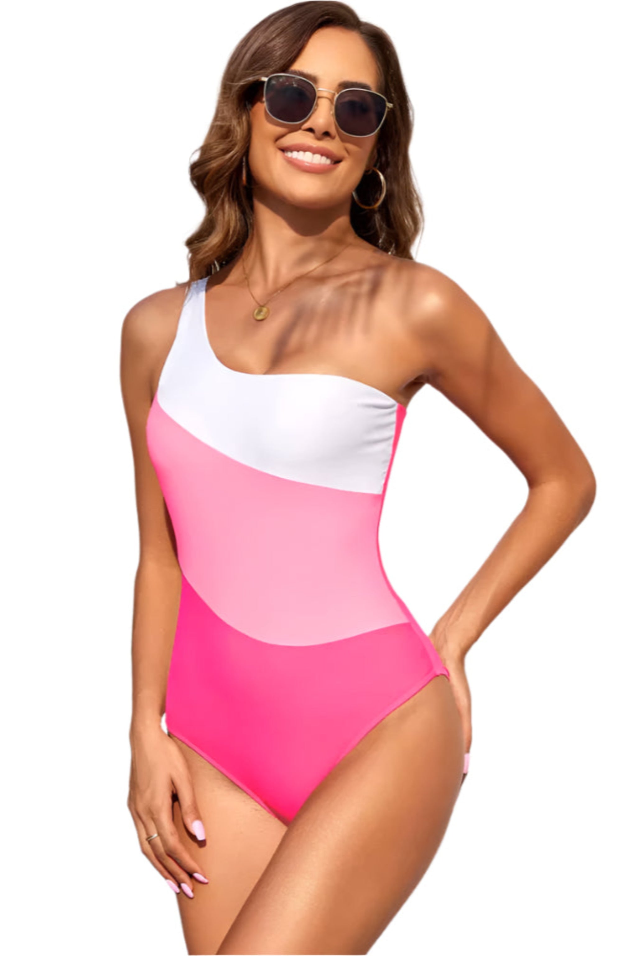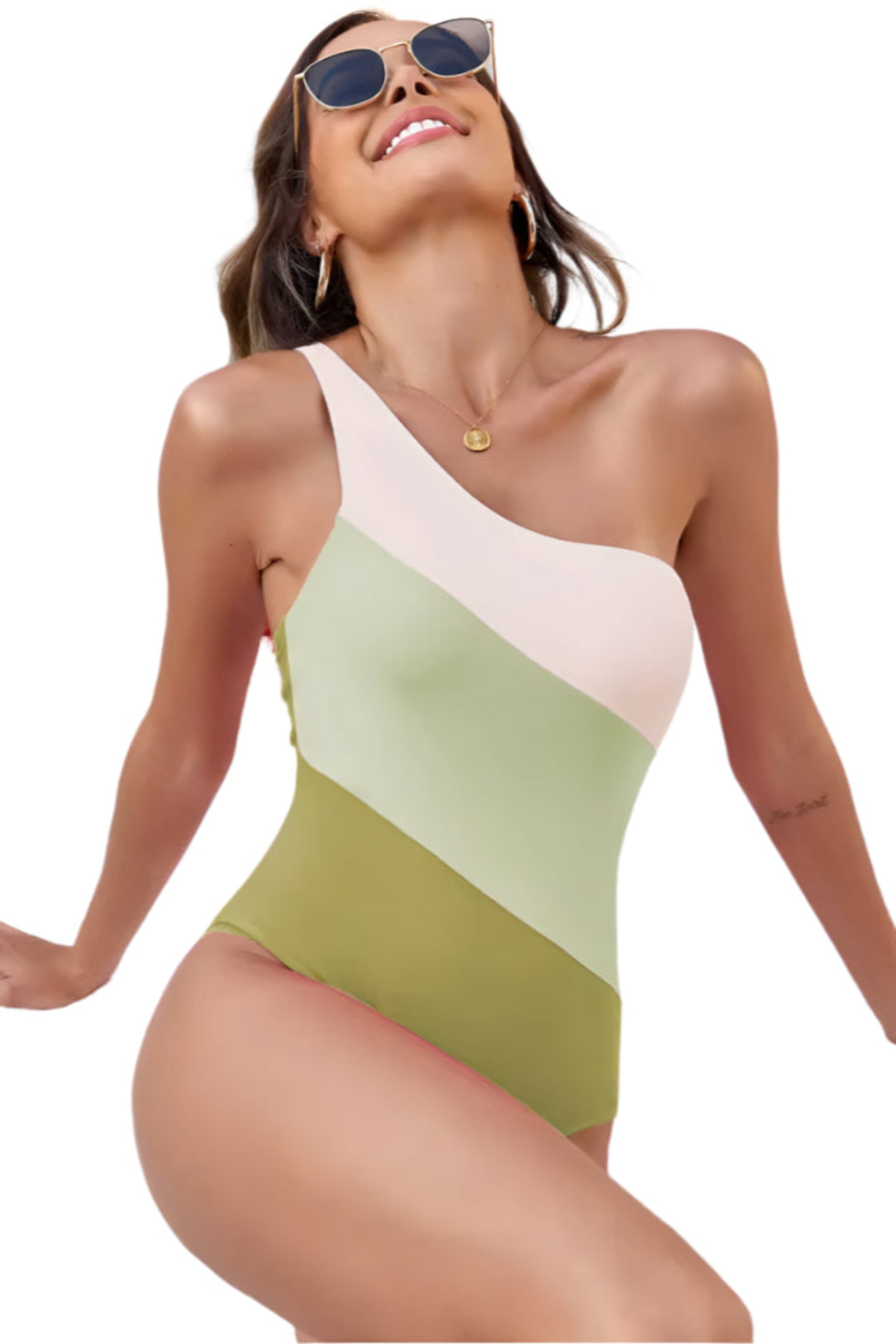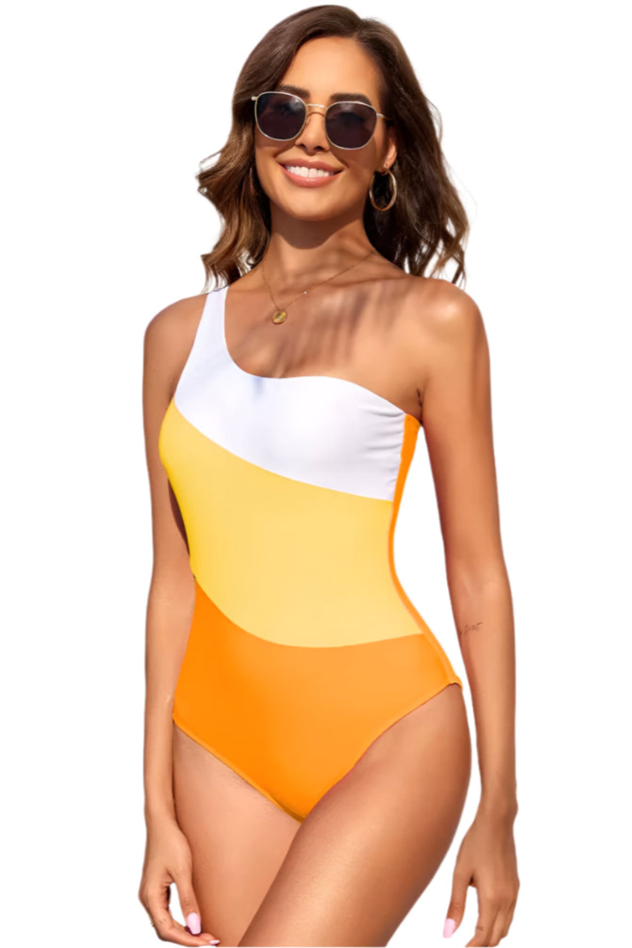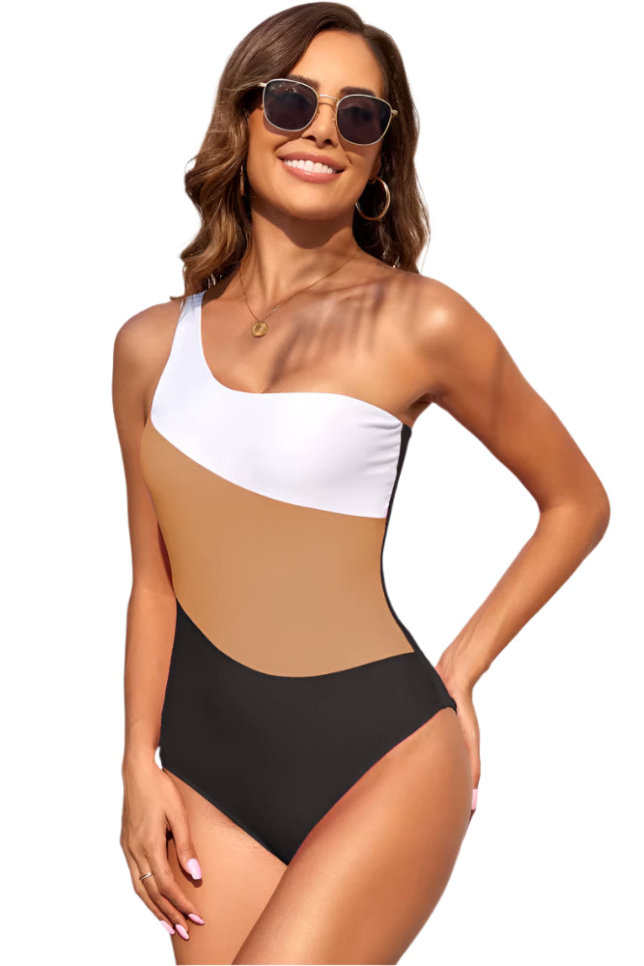 Traje de baño de una pieza con un hombro al descubierto y bloques de color