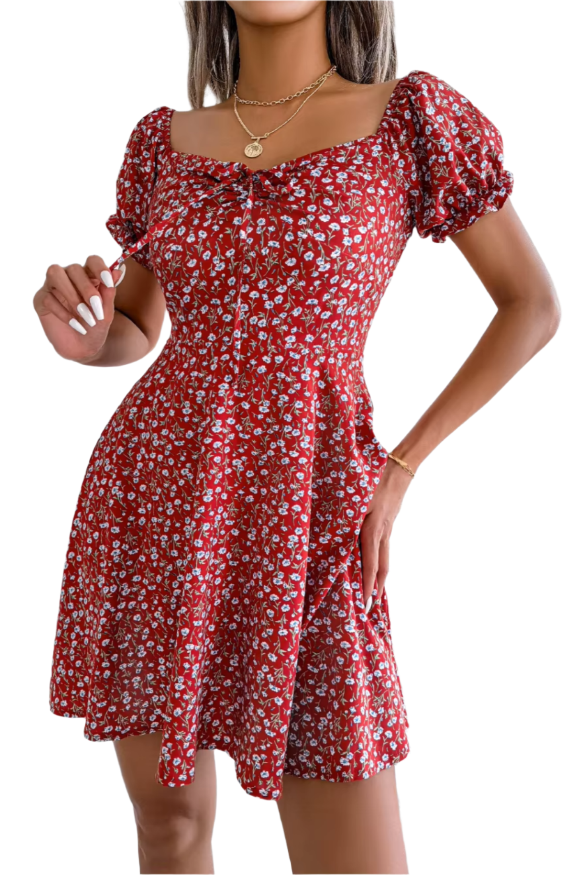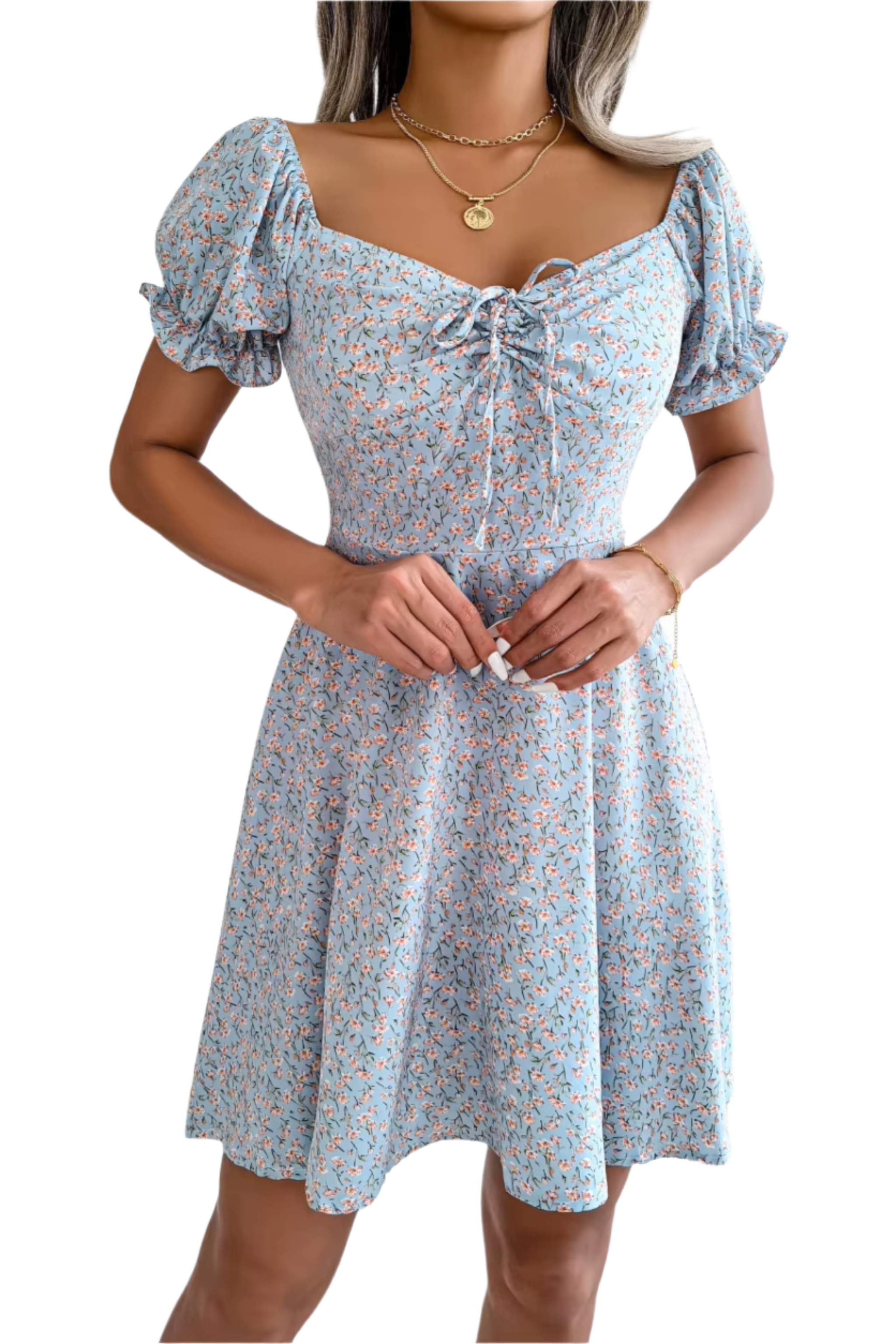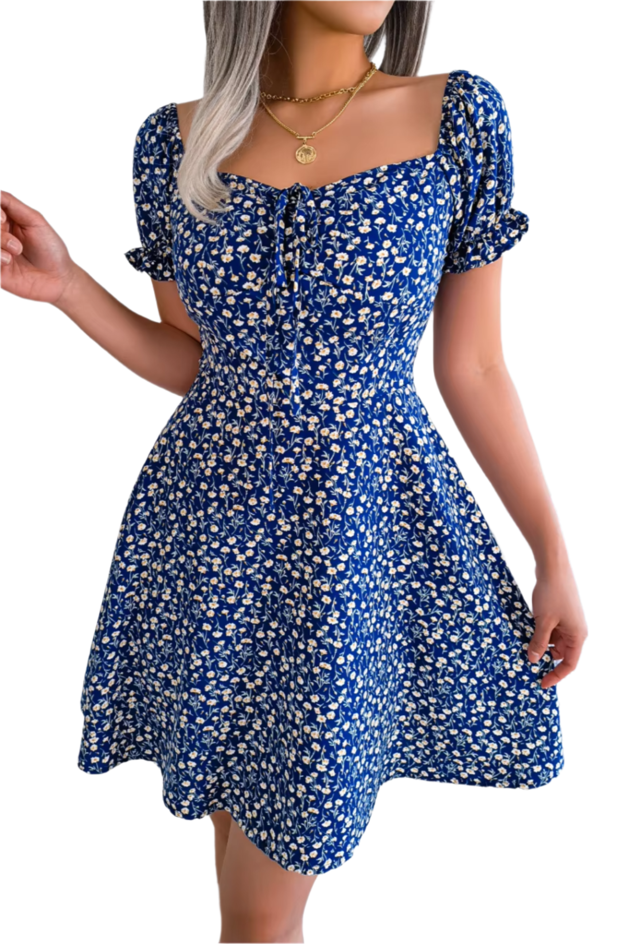 Robe fleurie à col noué et taille évasée