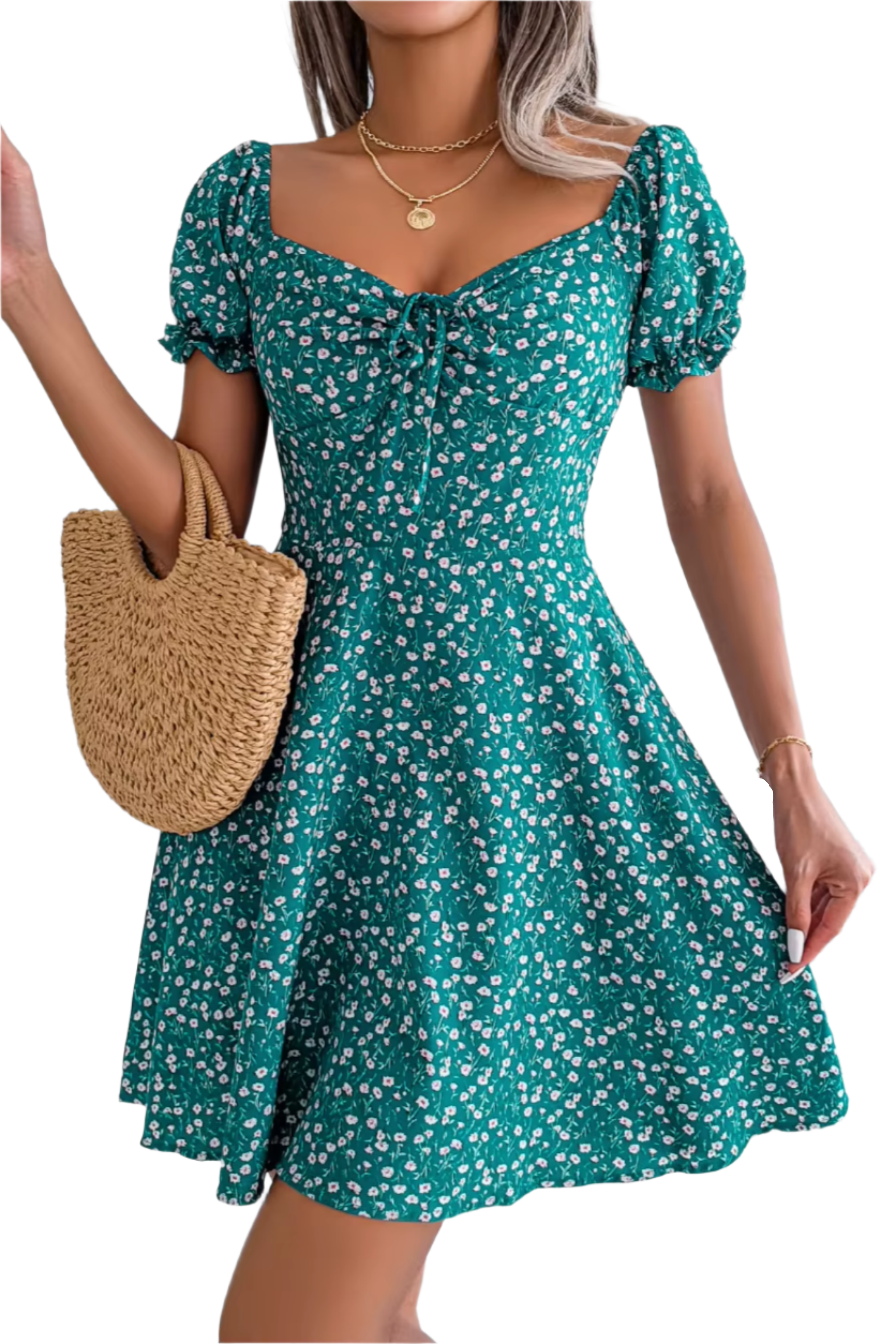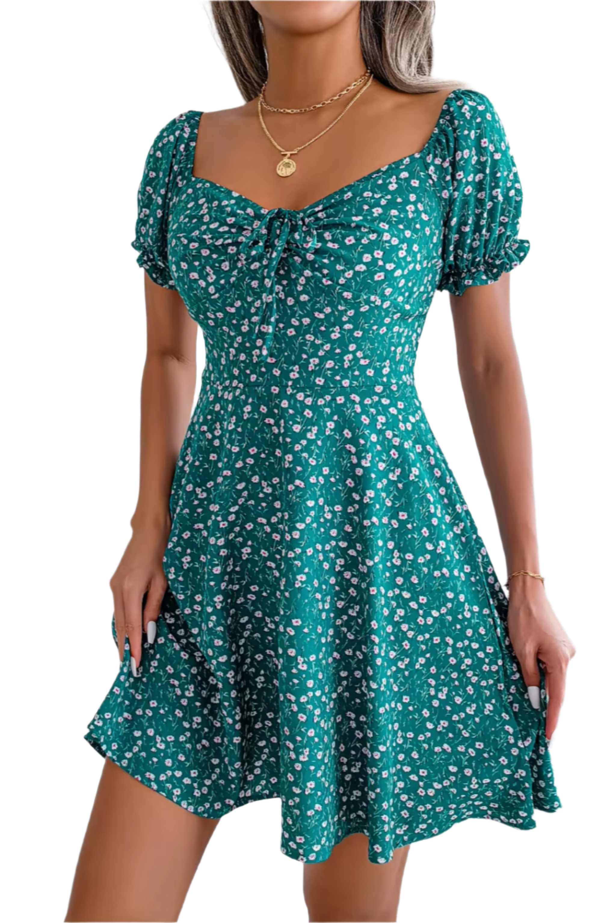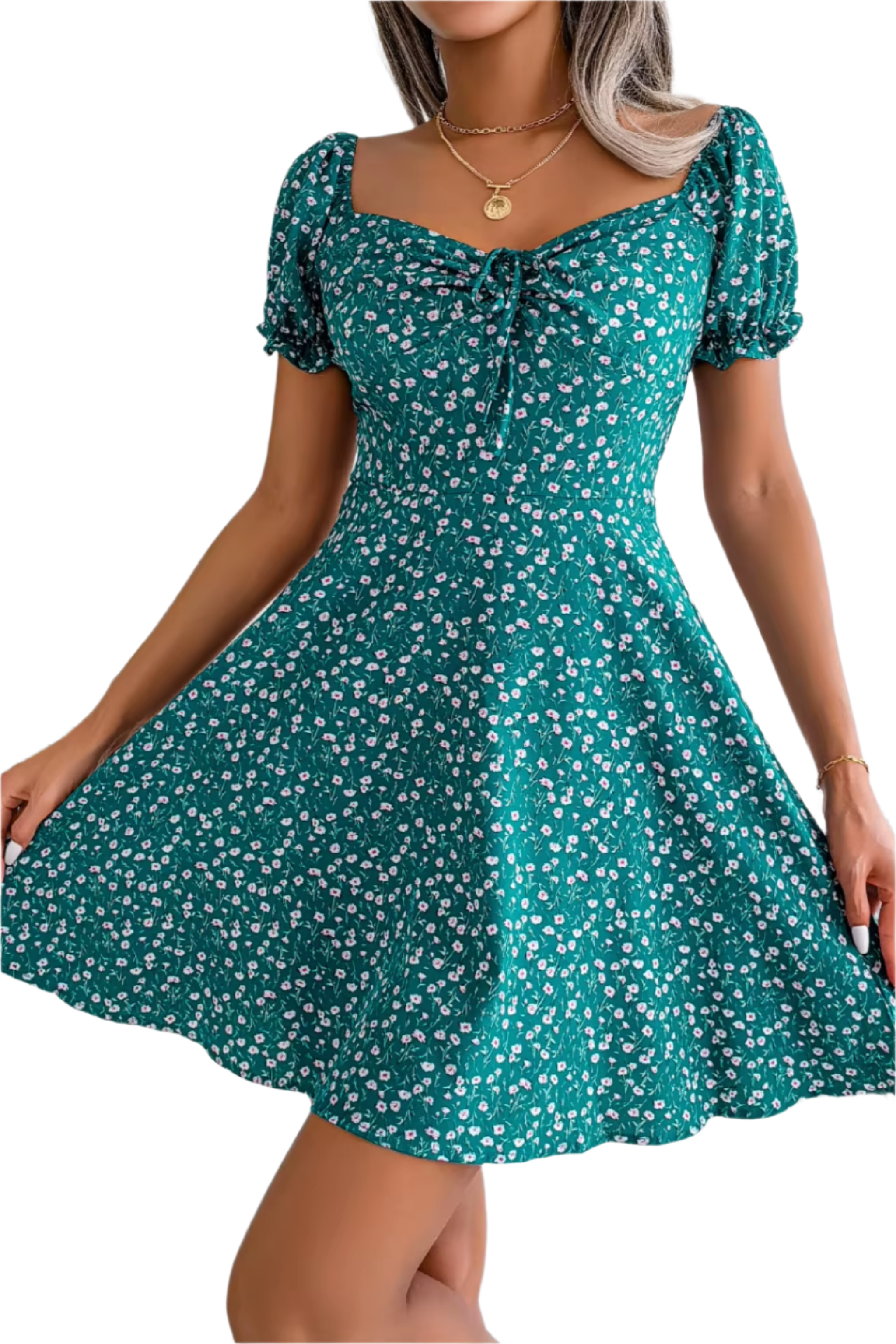 Robe fleurie à col noué et taille évasée