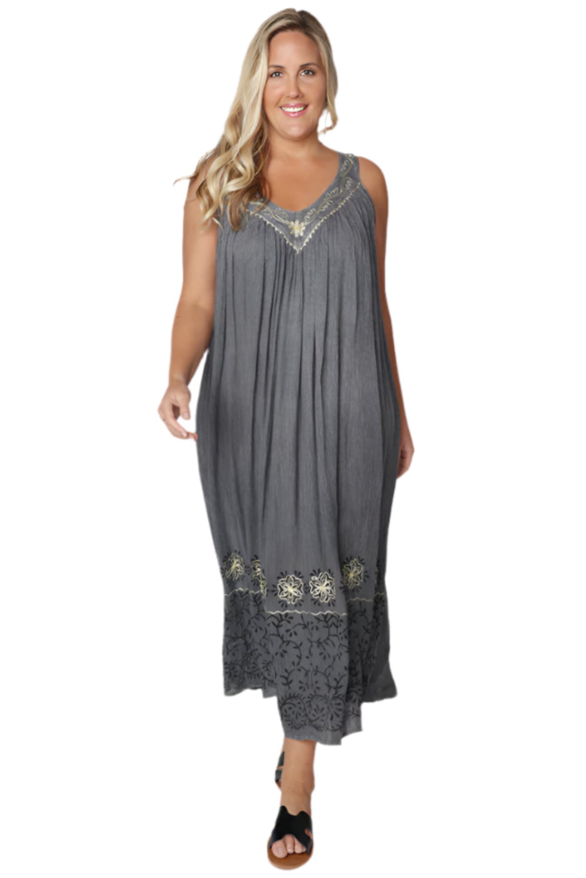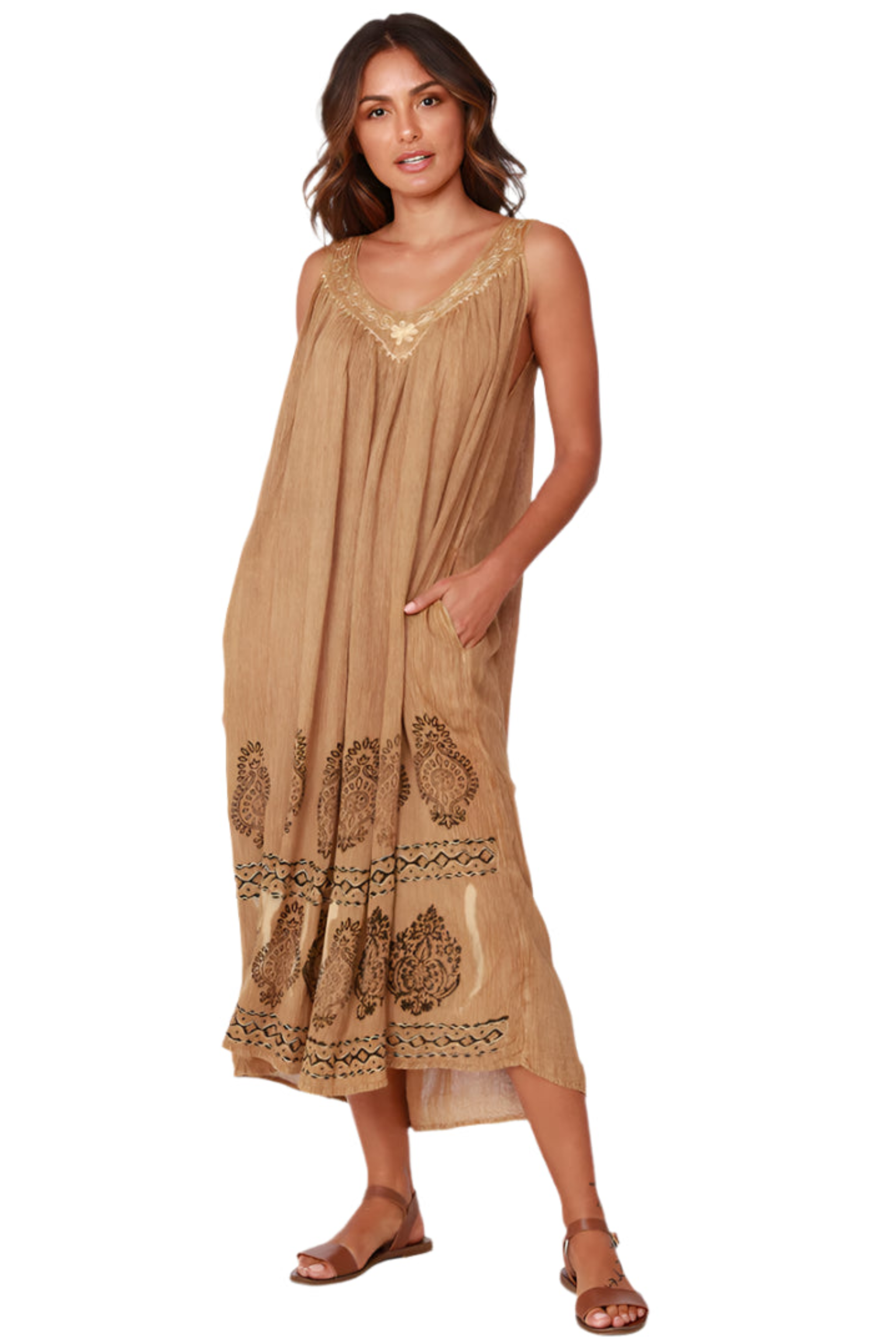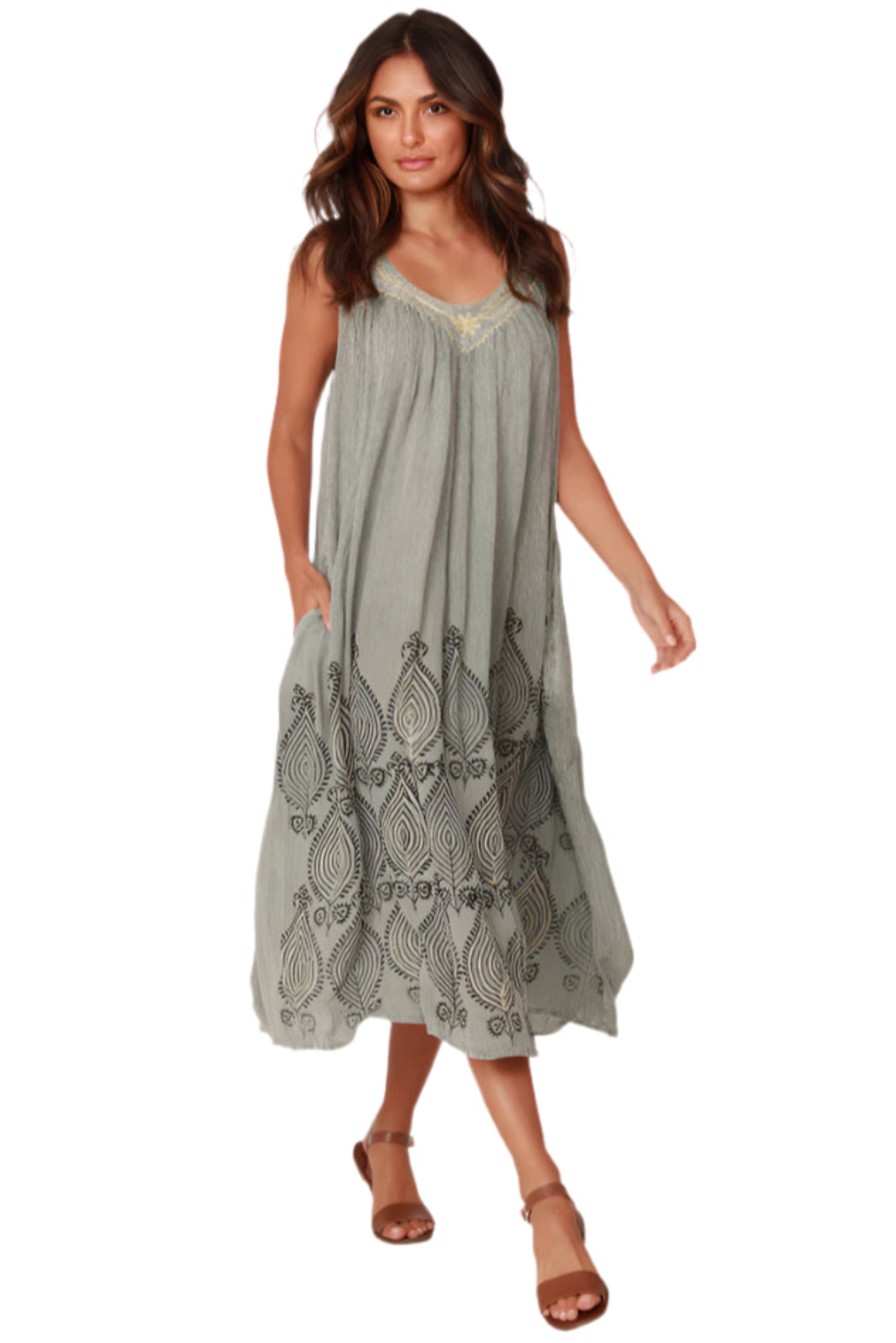 Robe longue parapluie en rayonne froissée avec imprimé et broderie