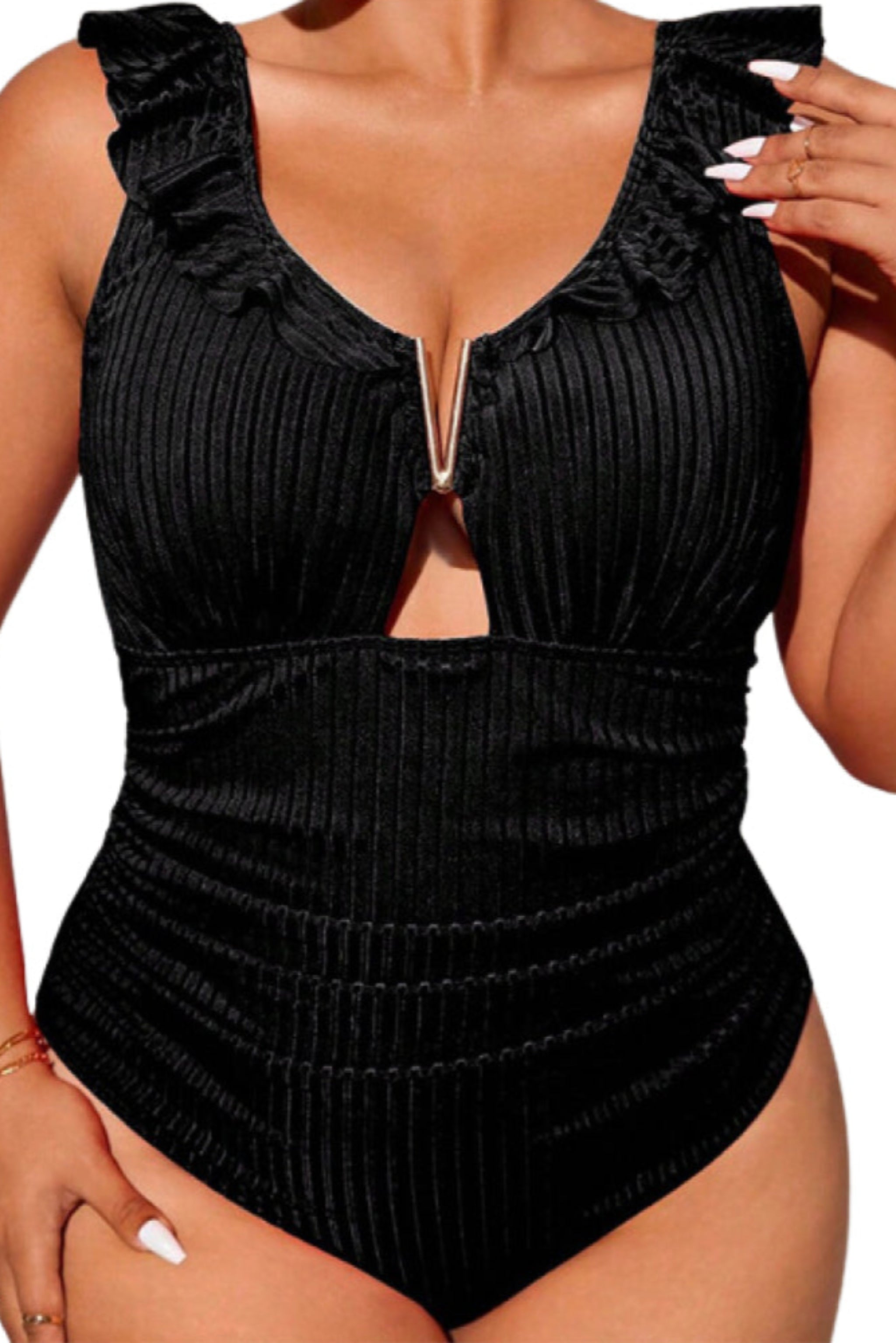 Maillot de bain une pièce grande taille à col volanté, découpe en V, froncé et côtelé