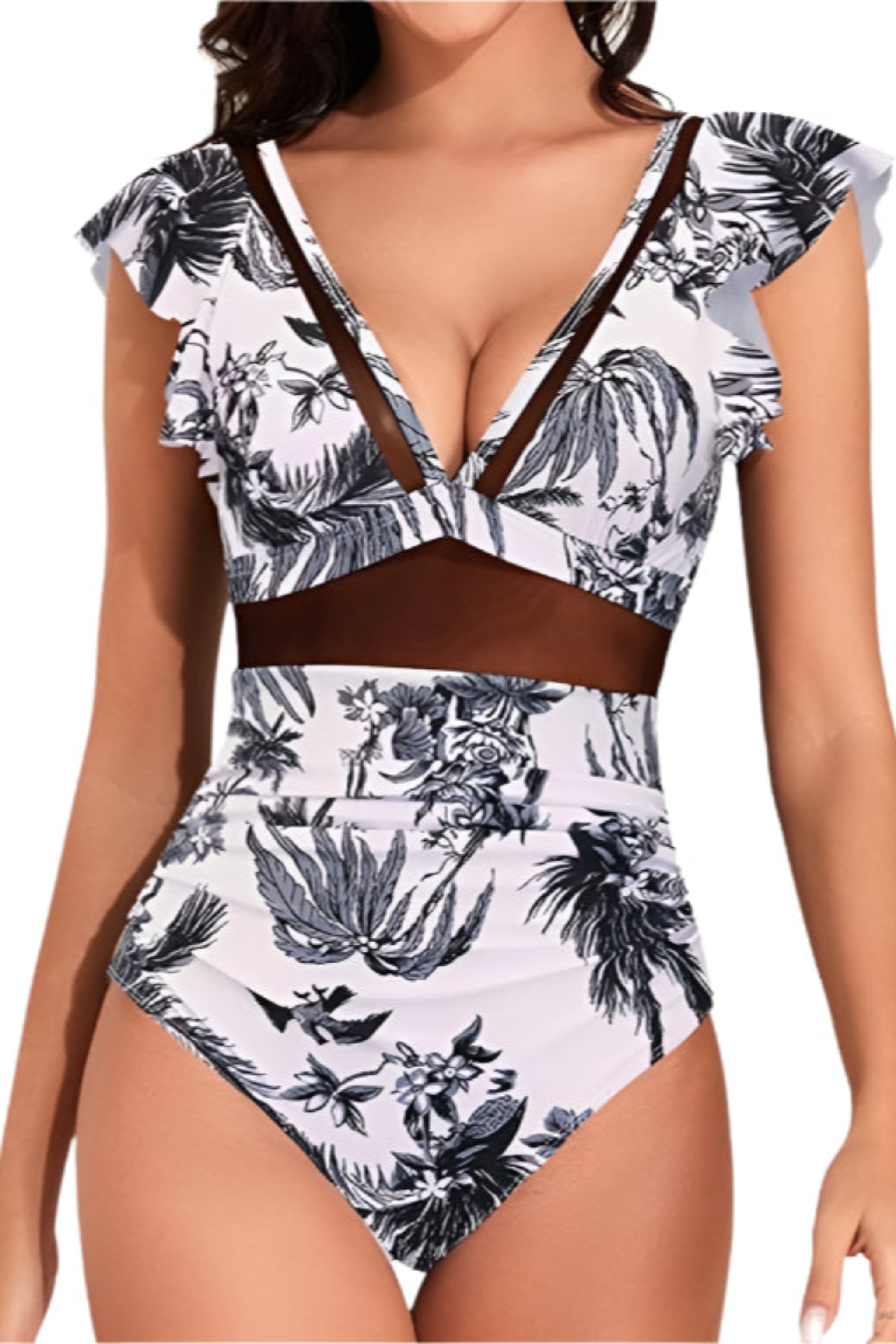 Mesh Stripe Ruffle Sleeve One Piece Swimsuit