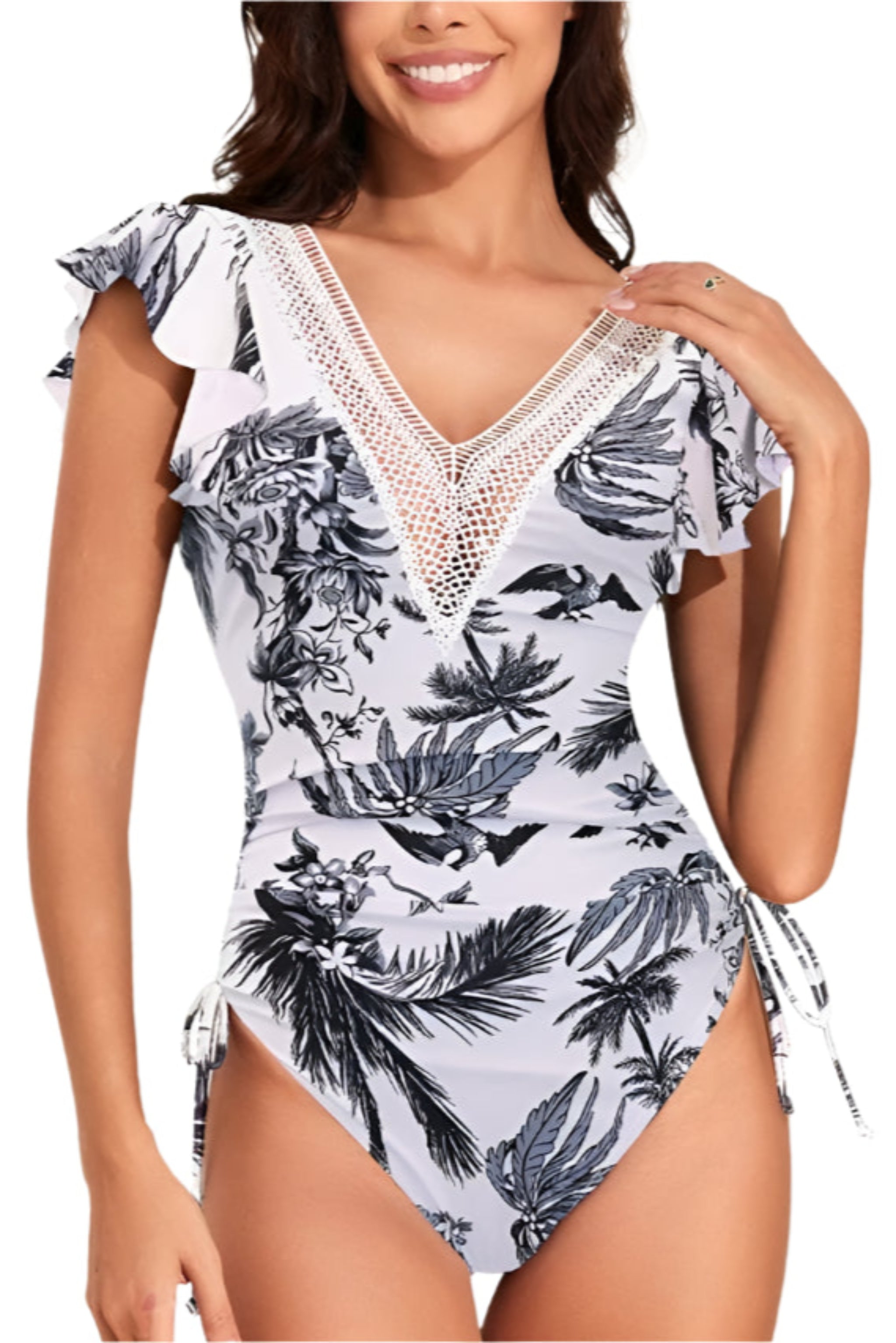 Maillot de bain une pièce en dentelle à manches volantées et col en V