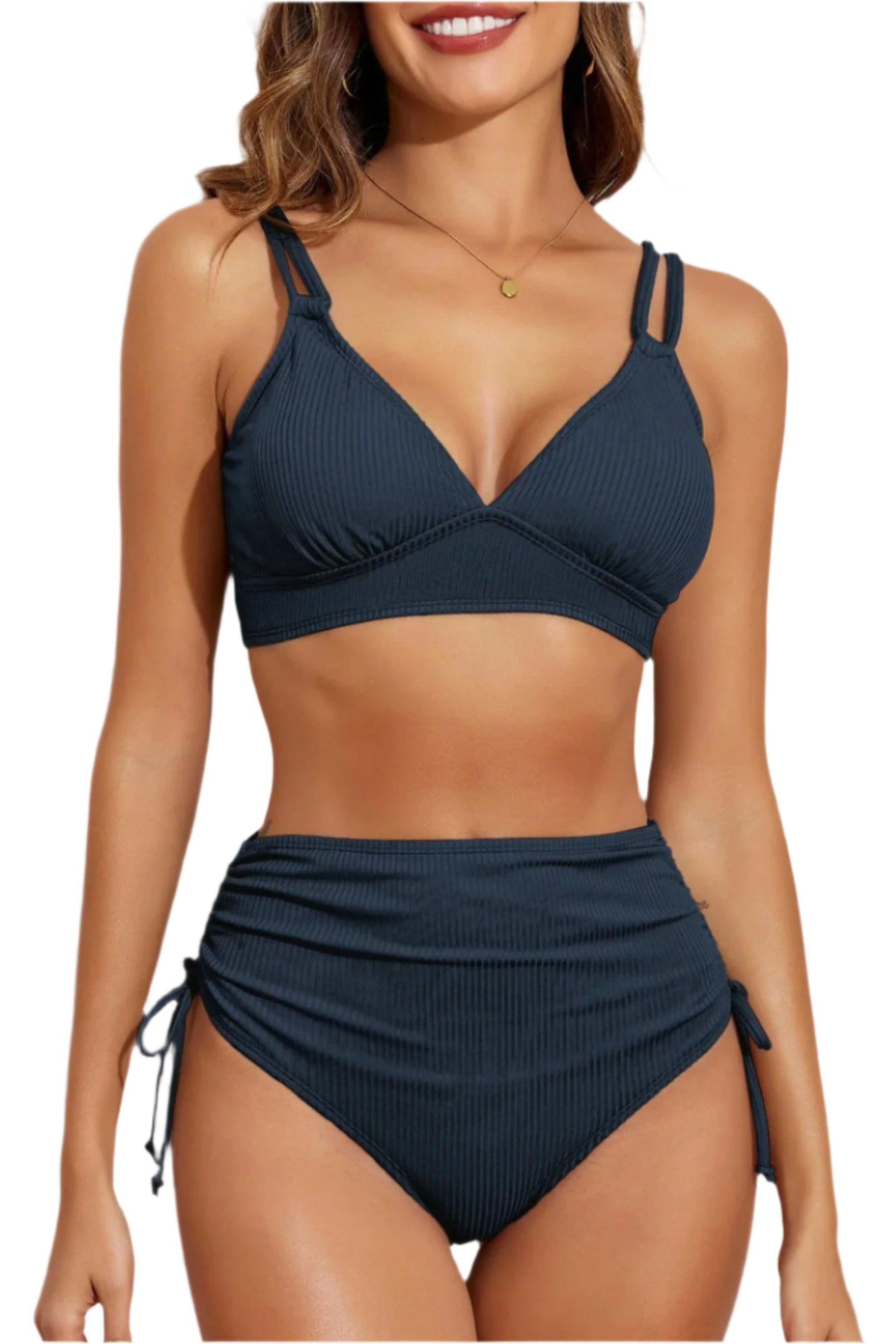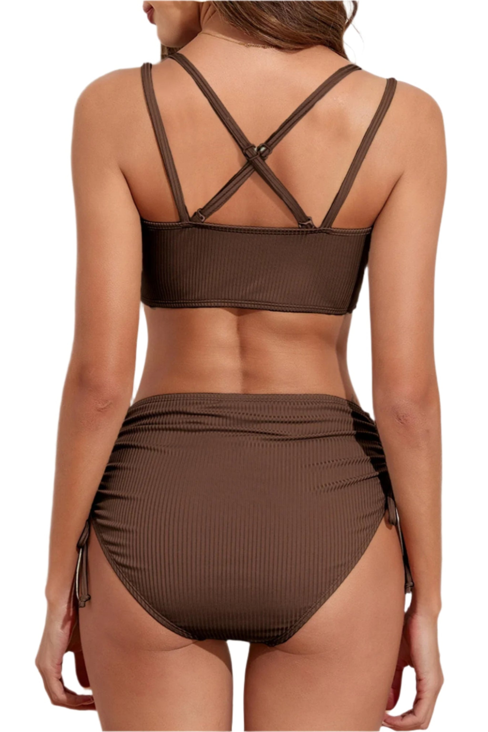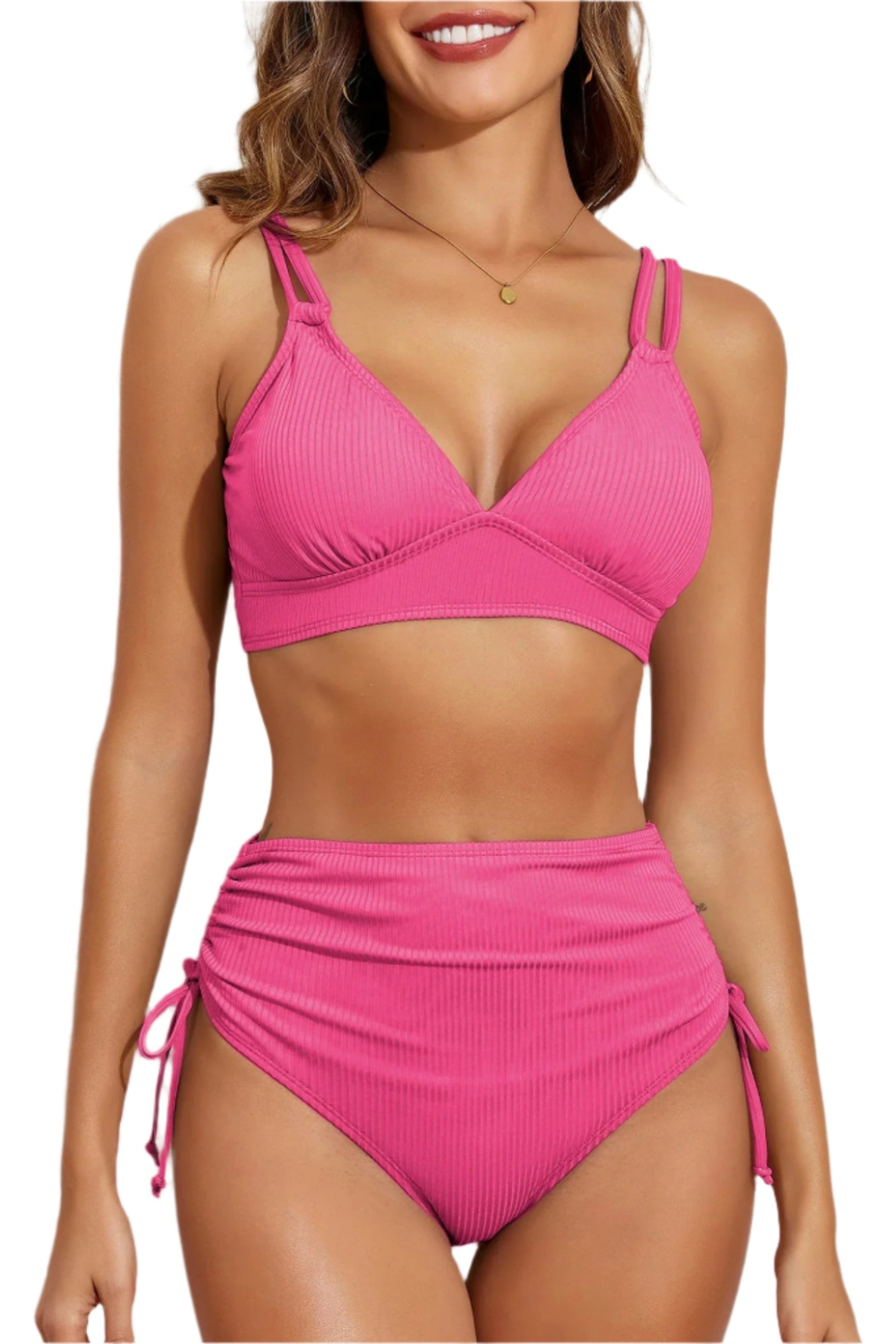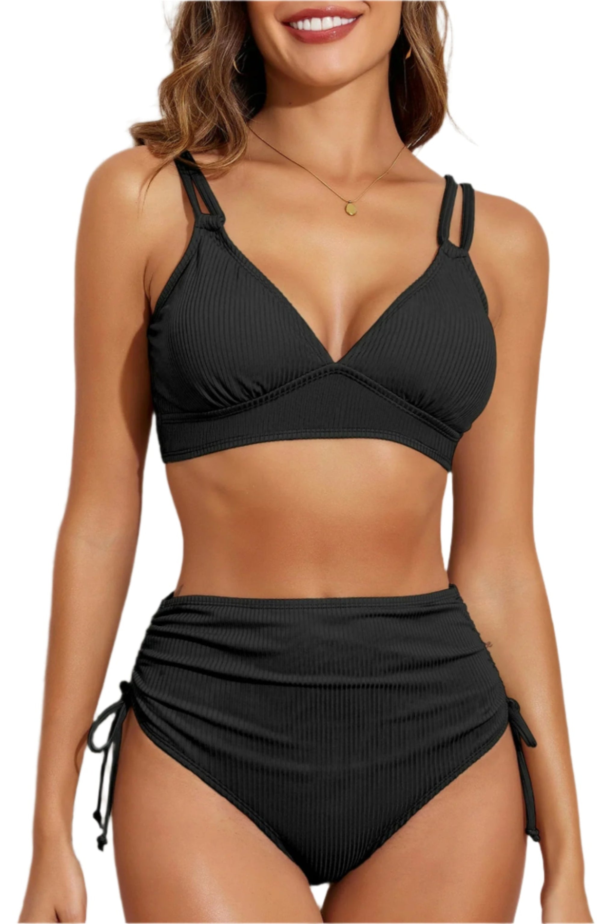 Maillot de bain deux pièces côtelé à col en V et doubles bretelles