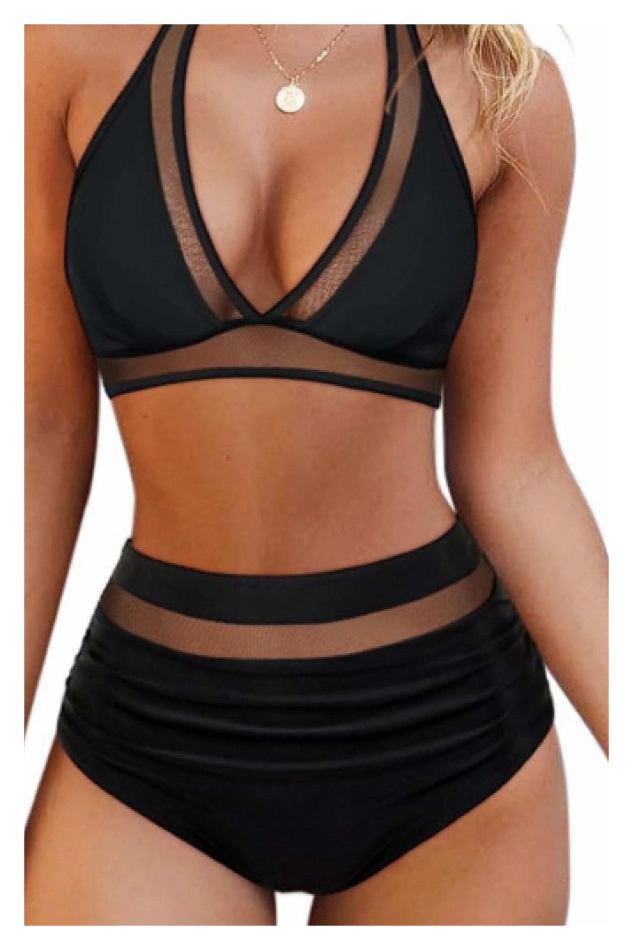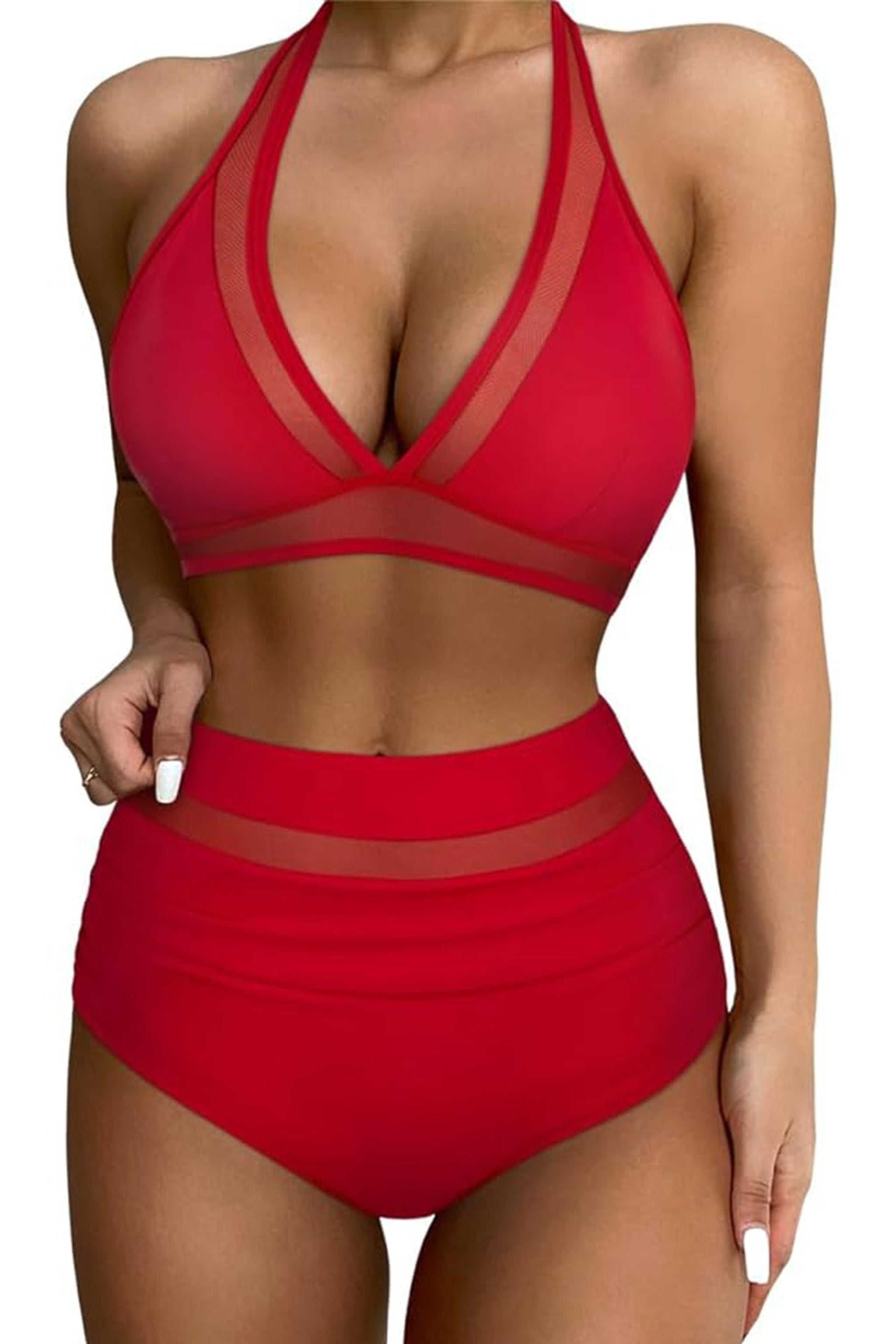 Mesh Trim Halter Two Piece Bikini Swimsuit