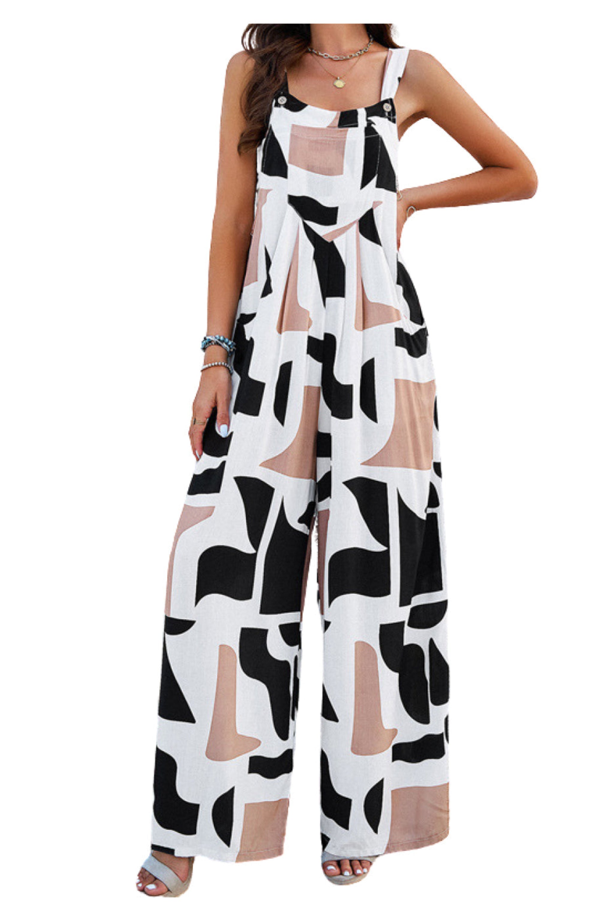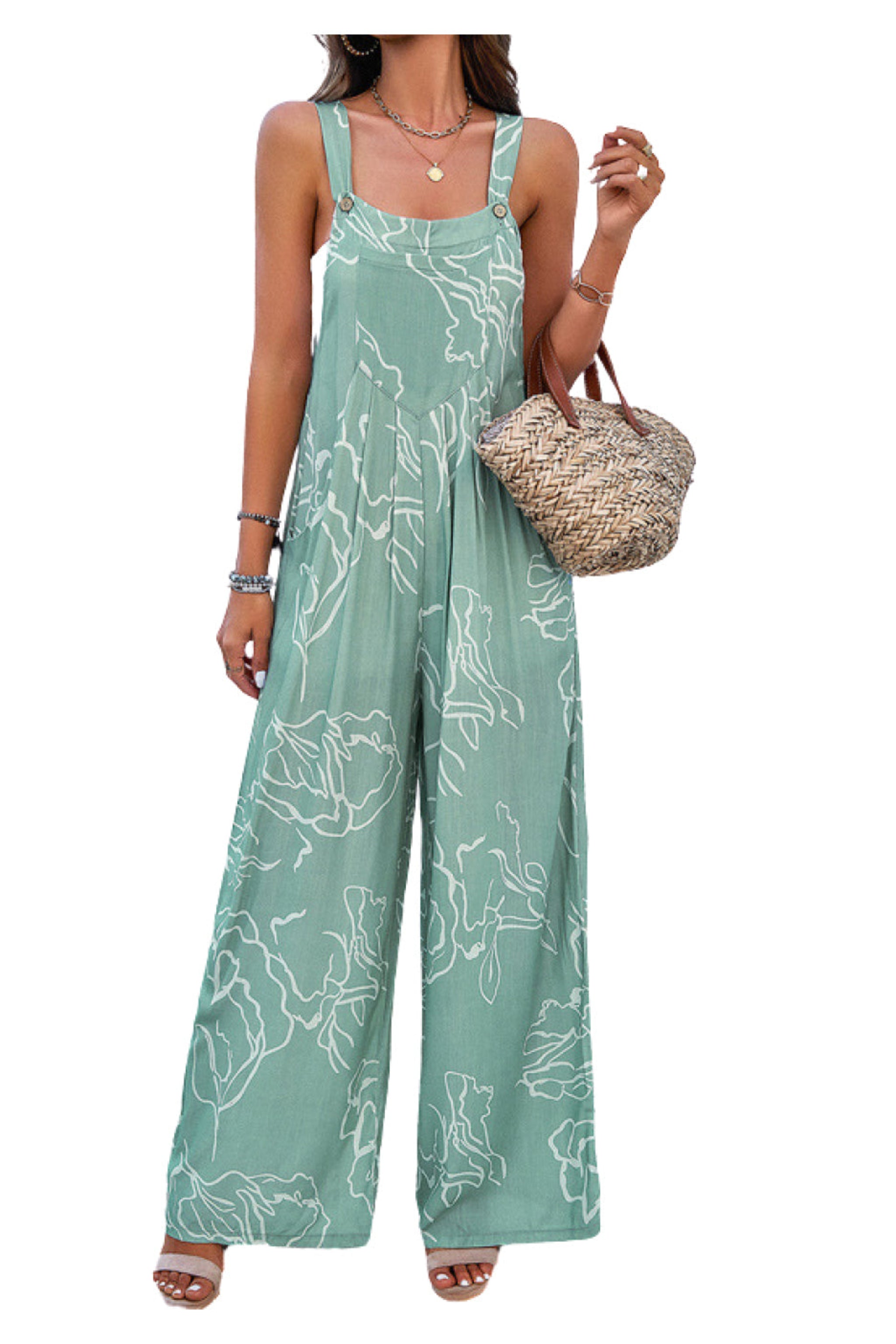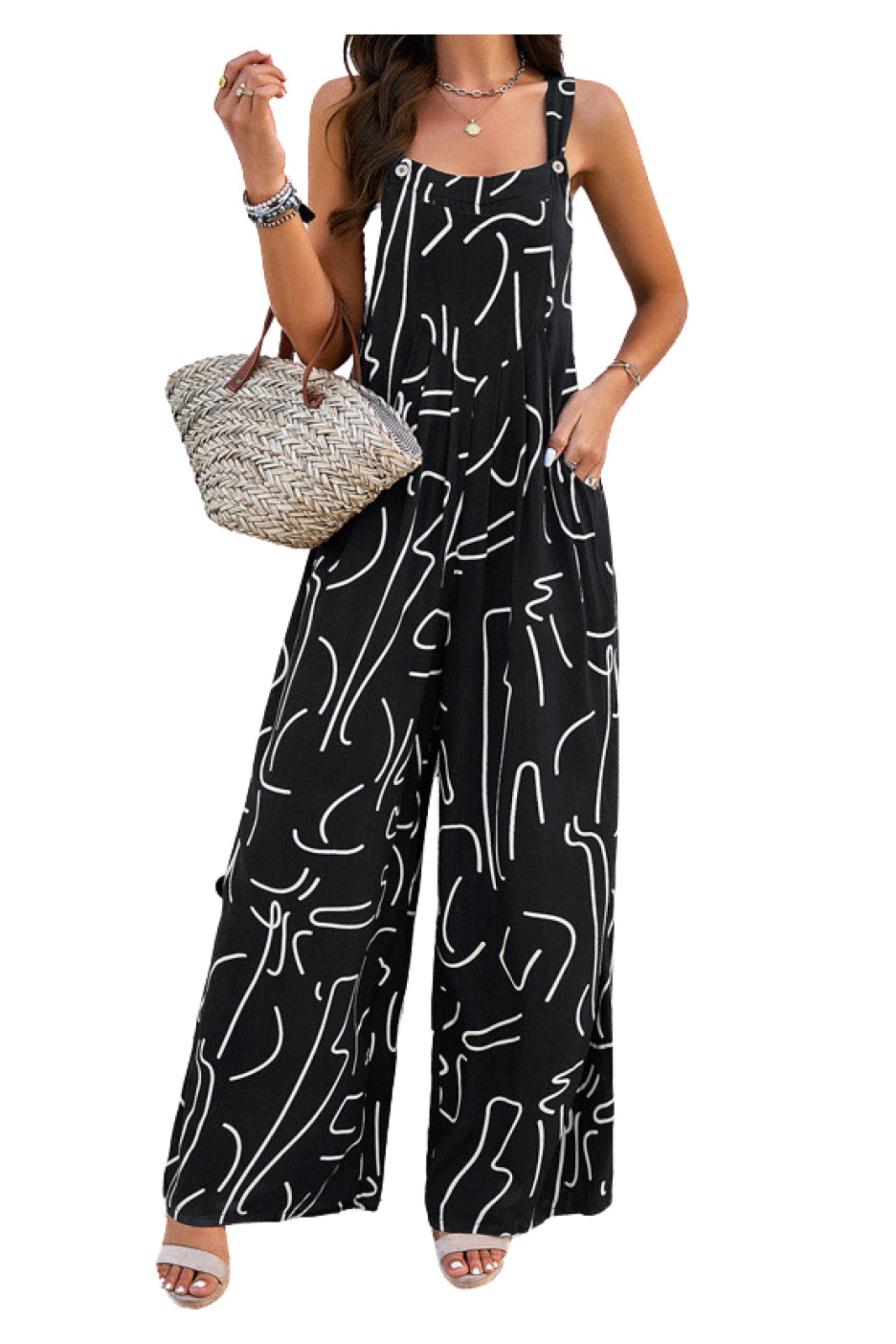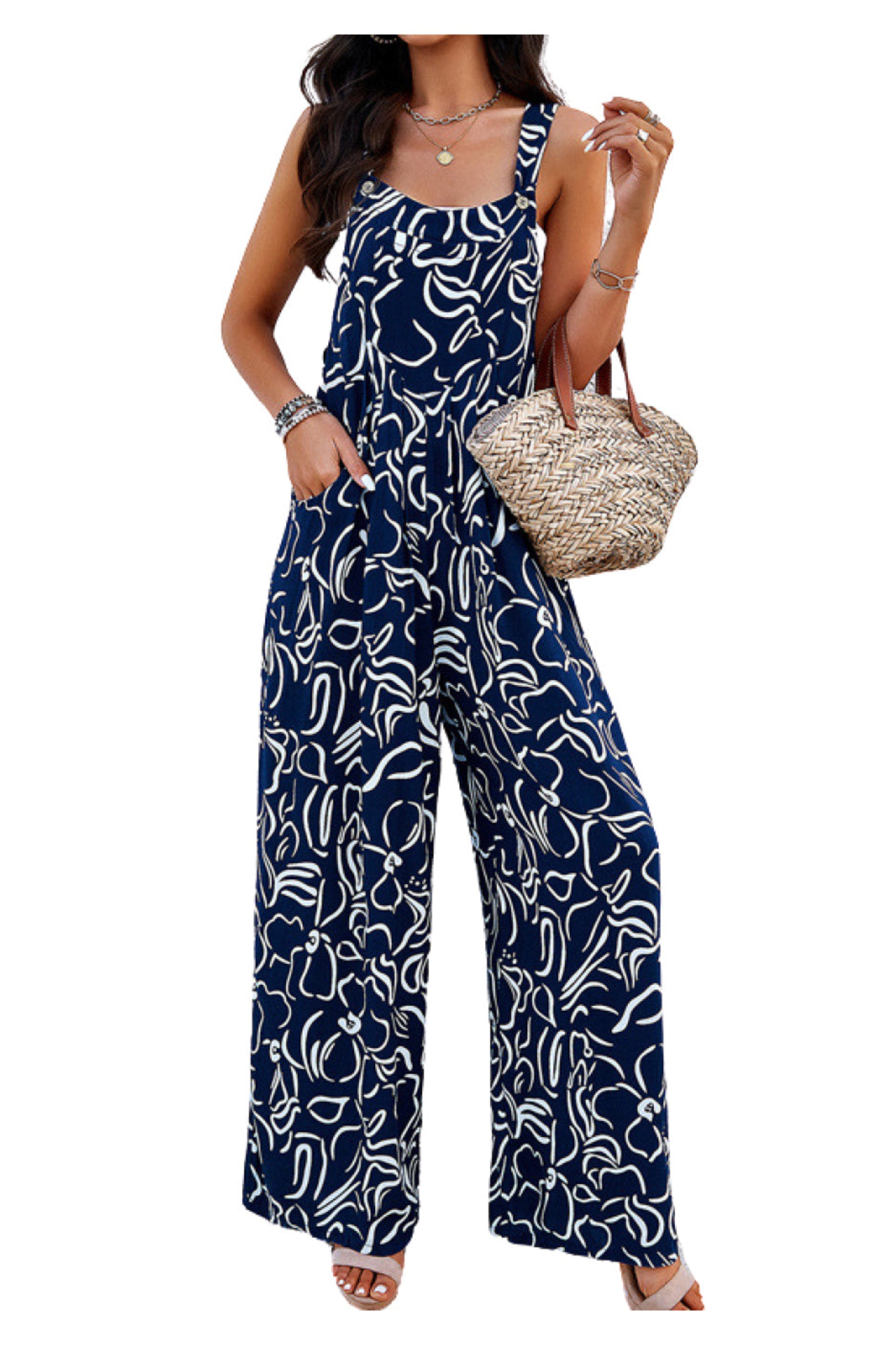Printed Kangaroo Pouch Button Strap Jumpsuit w/ Side Pockets
