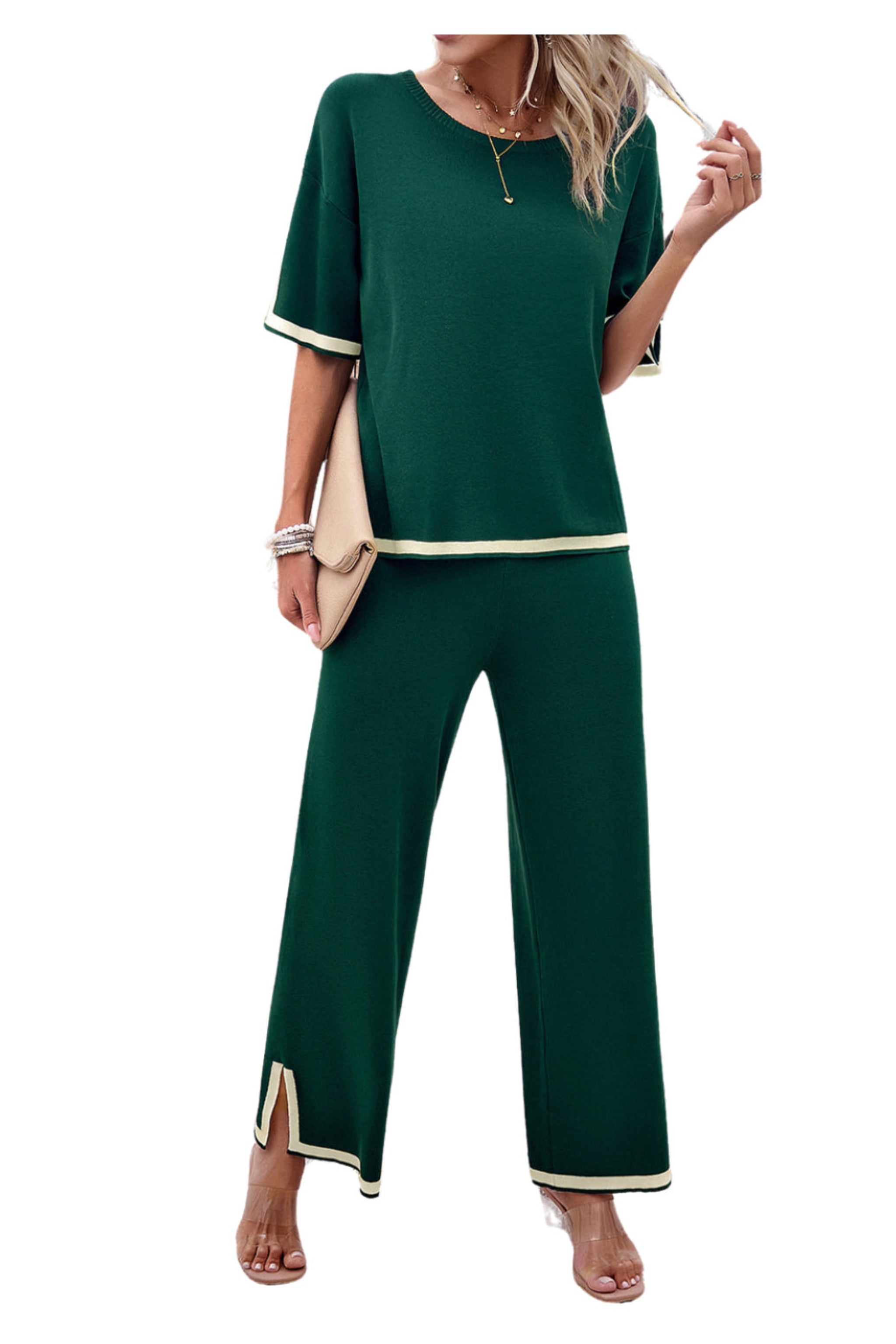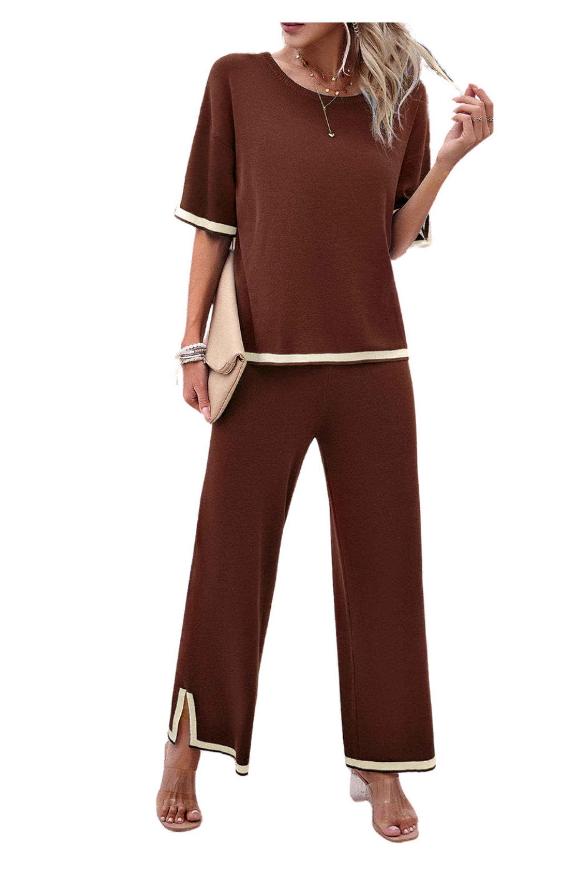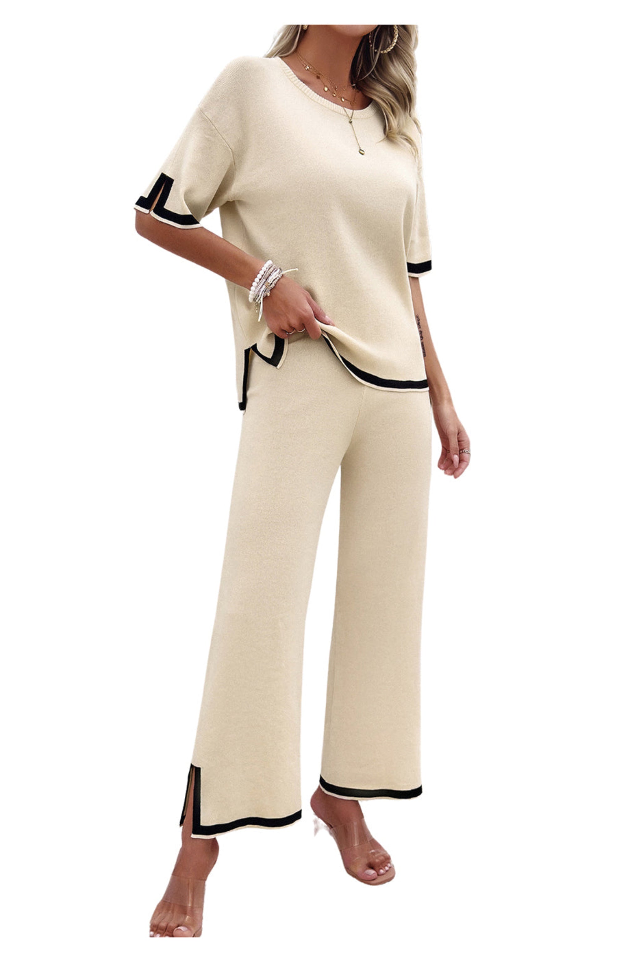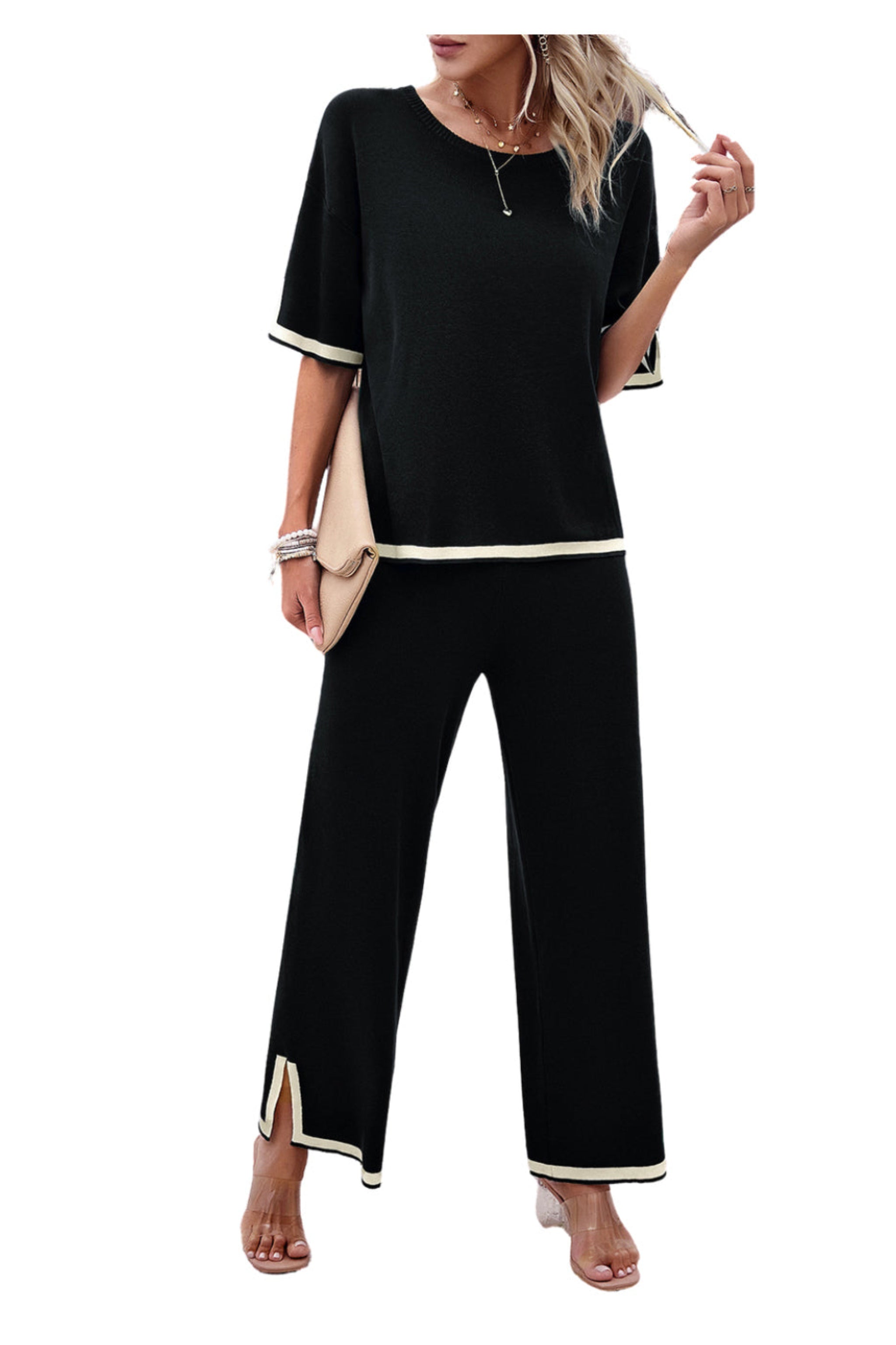 Ensemble haut et pantalon à manches courtes et fentes latérales en tricot contrasté