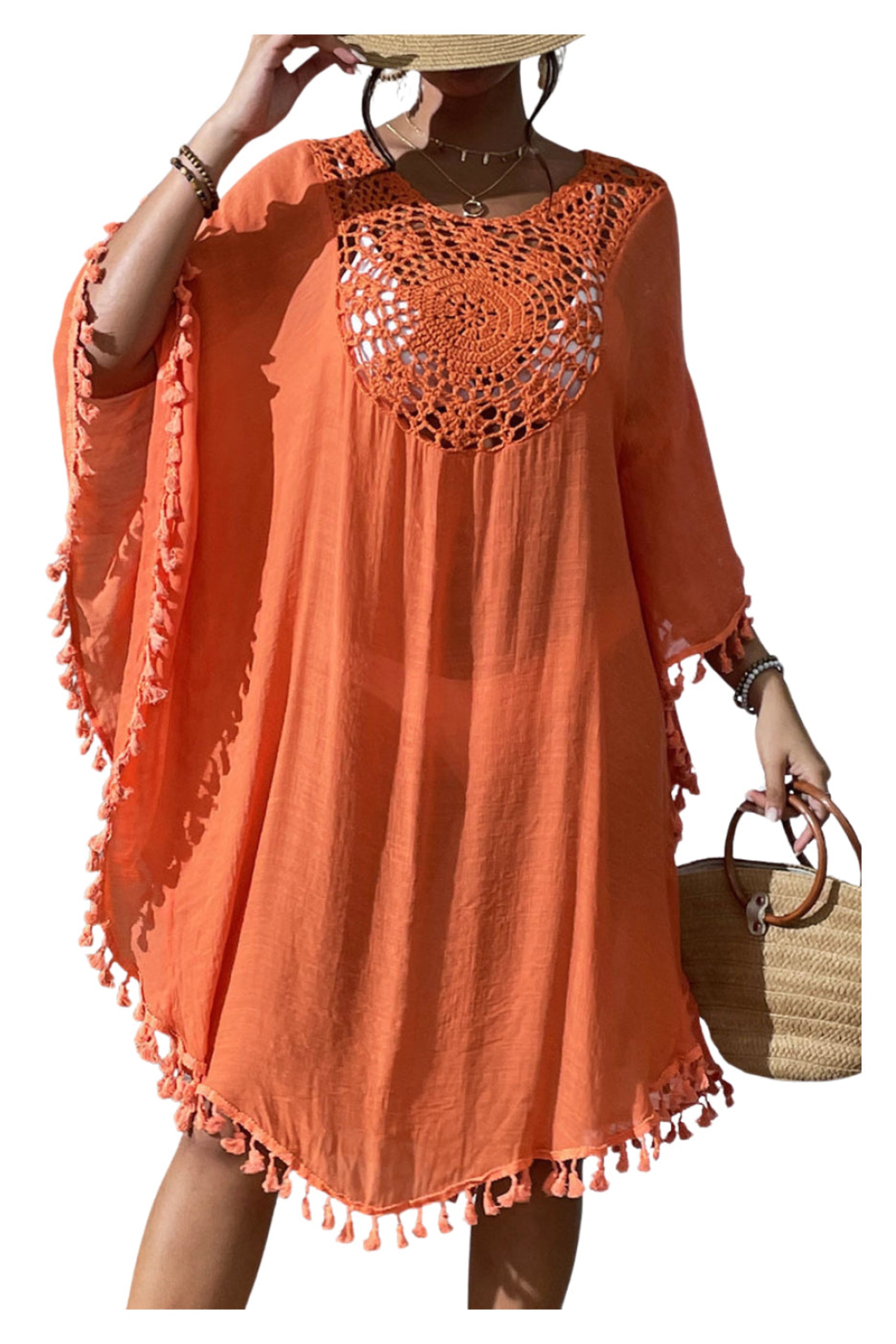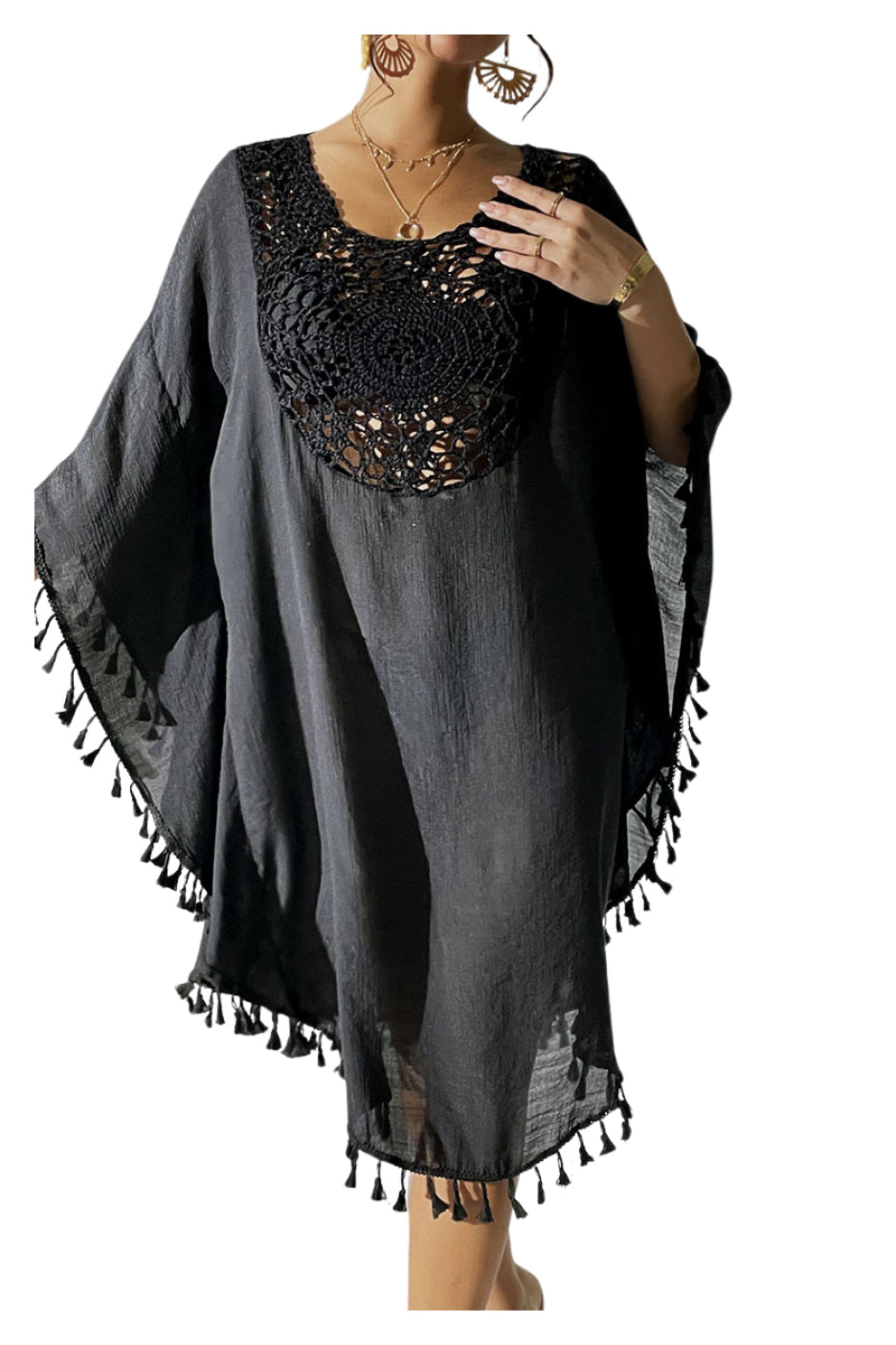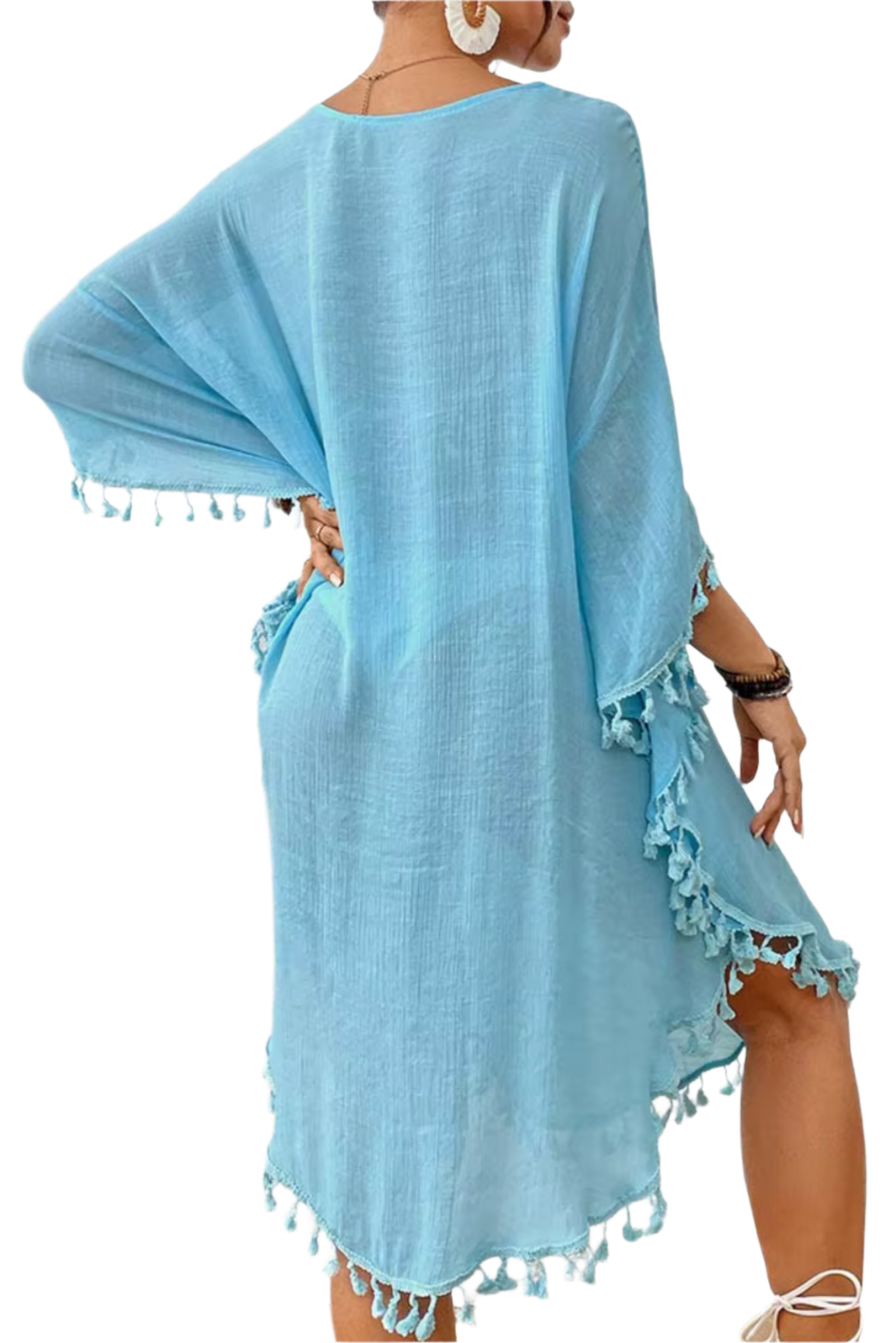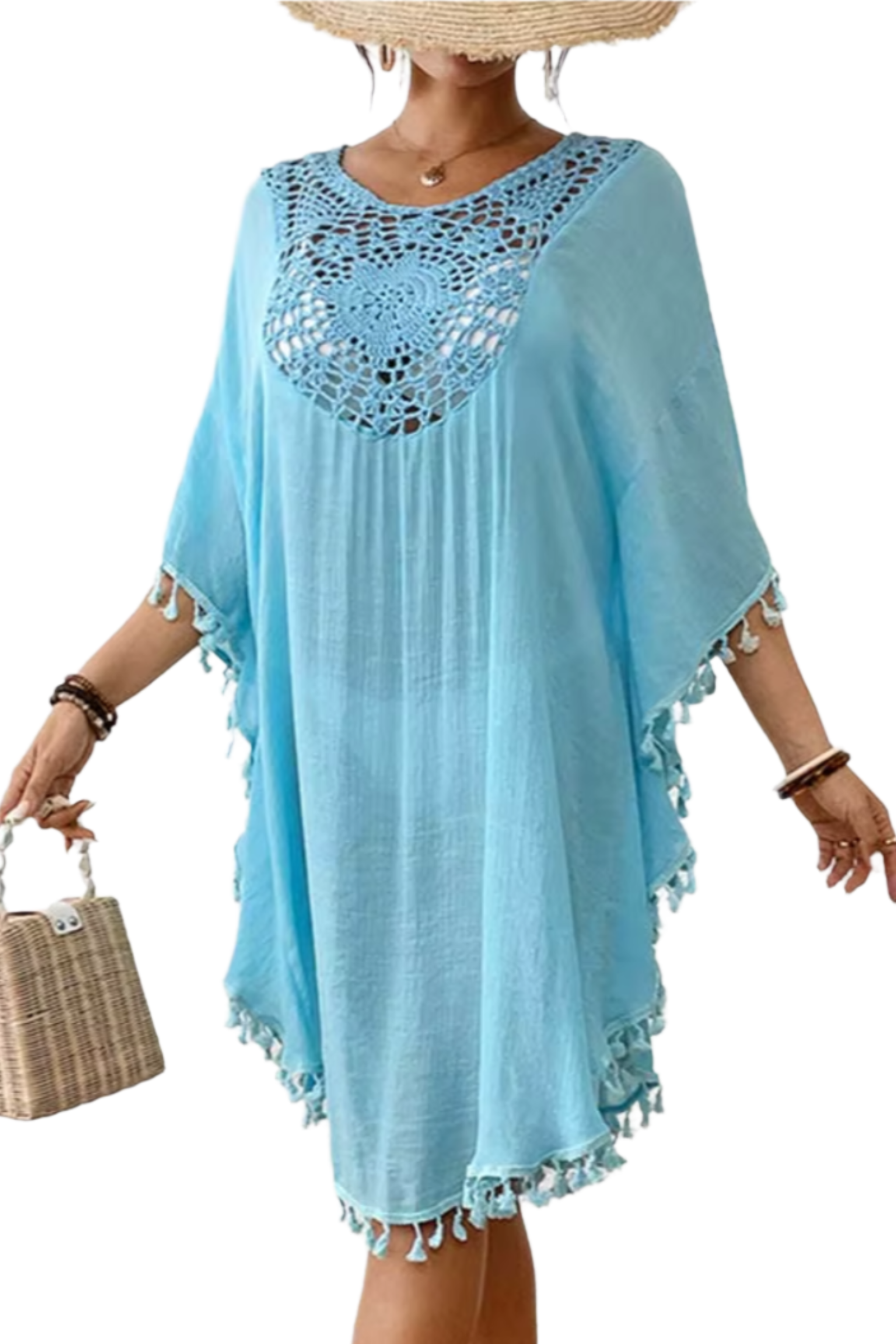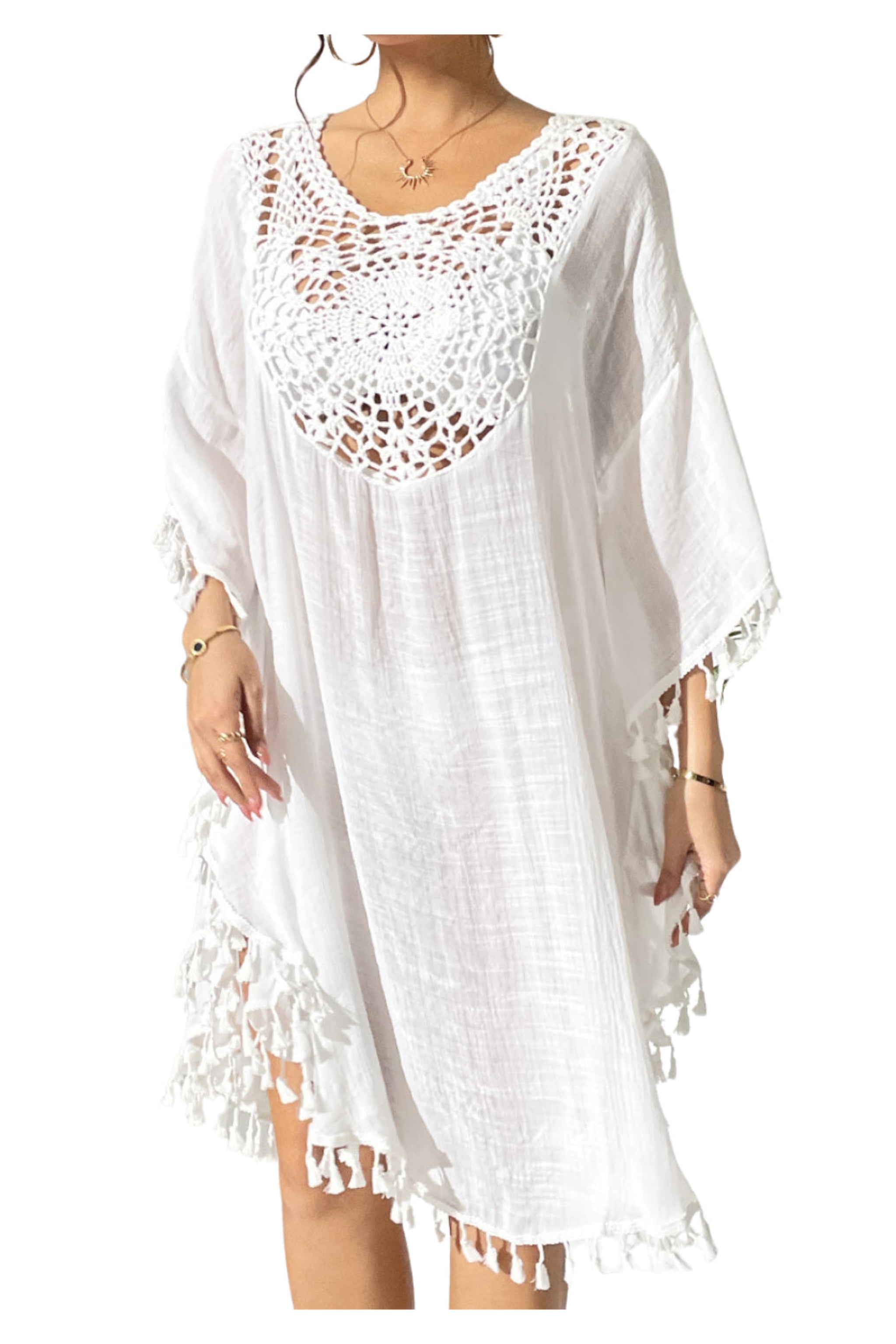 Tunique cache-maillot à manches 3/4 et bordure à pompons au crochet