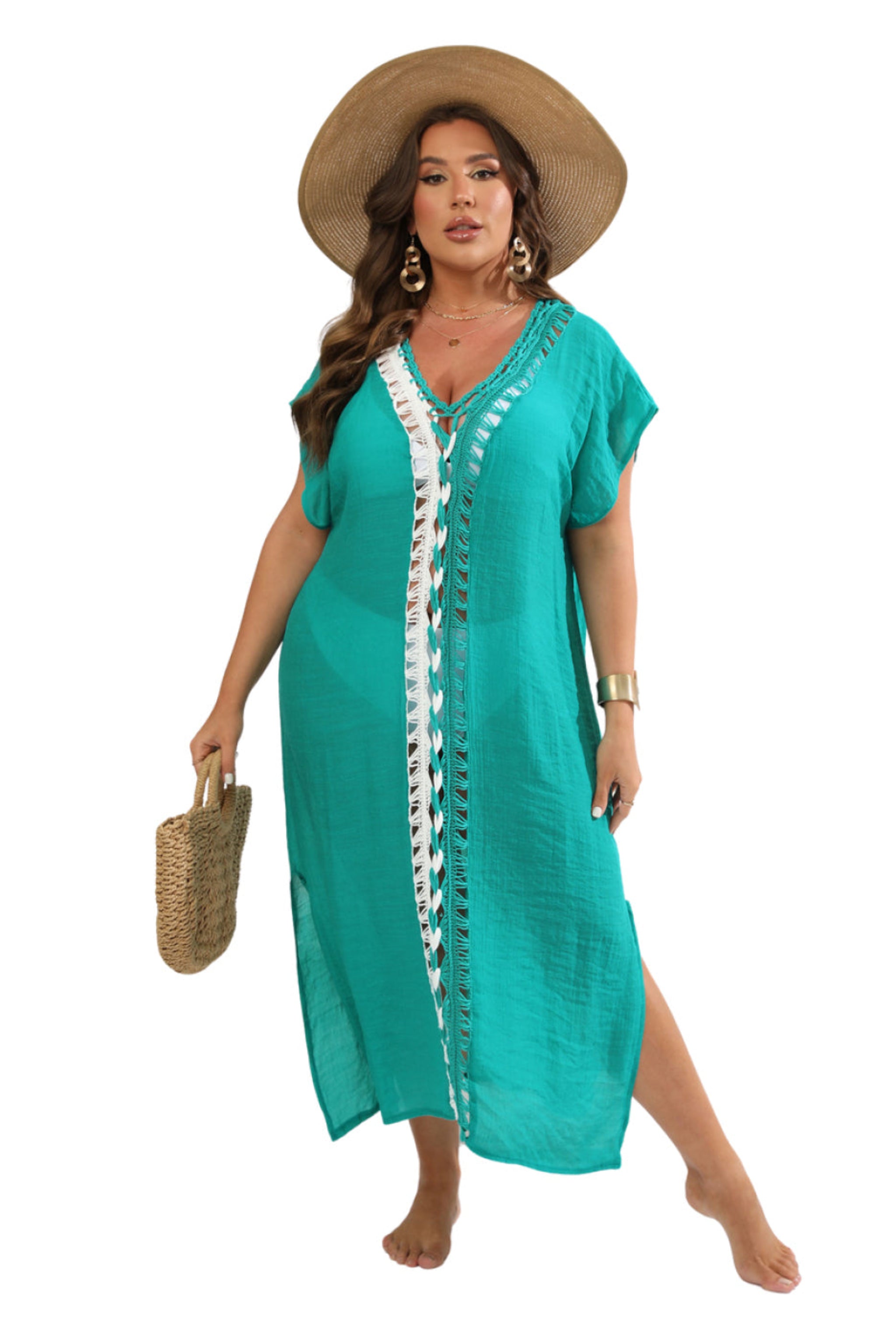 Crochet Two-Tone Center Detail Short Sleeve Cover Up Dress