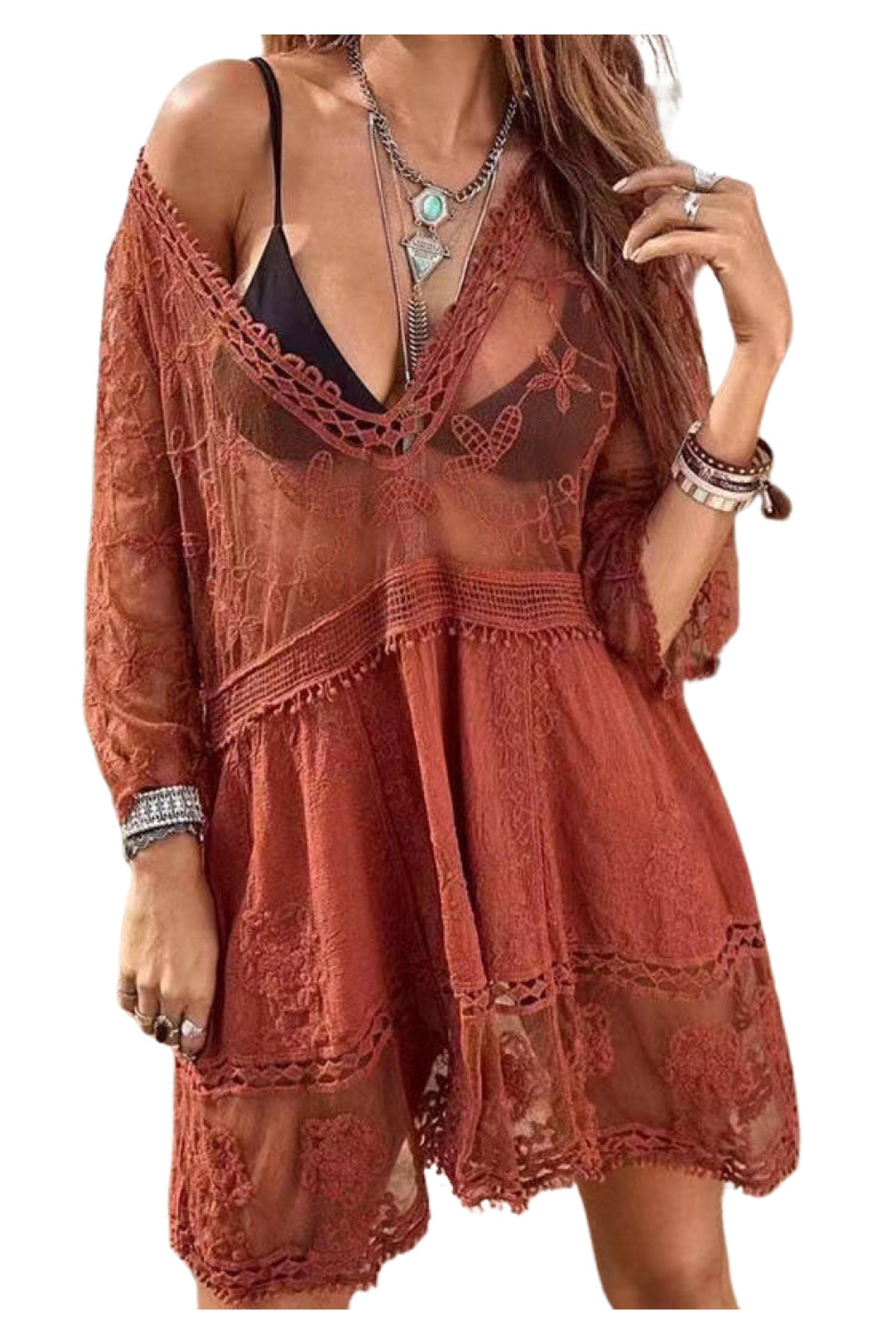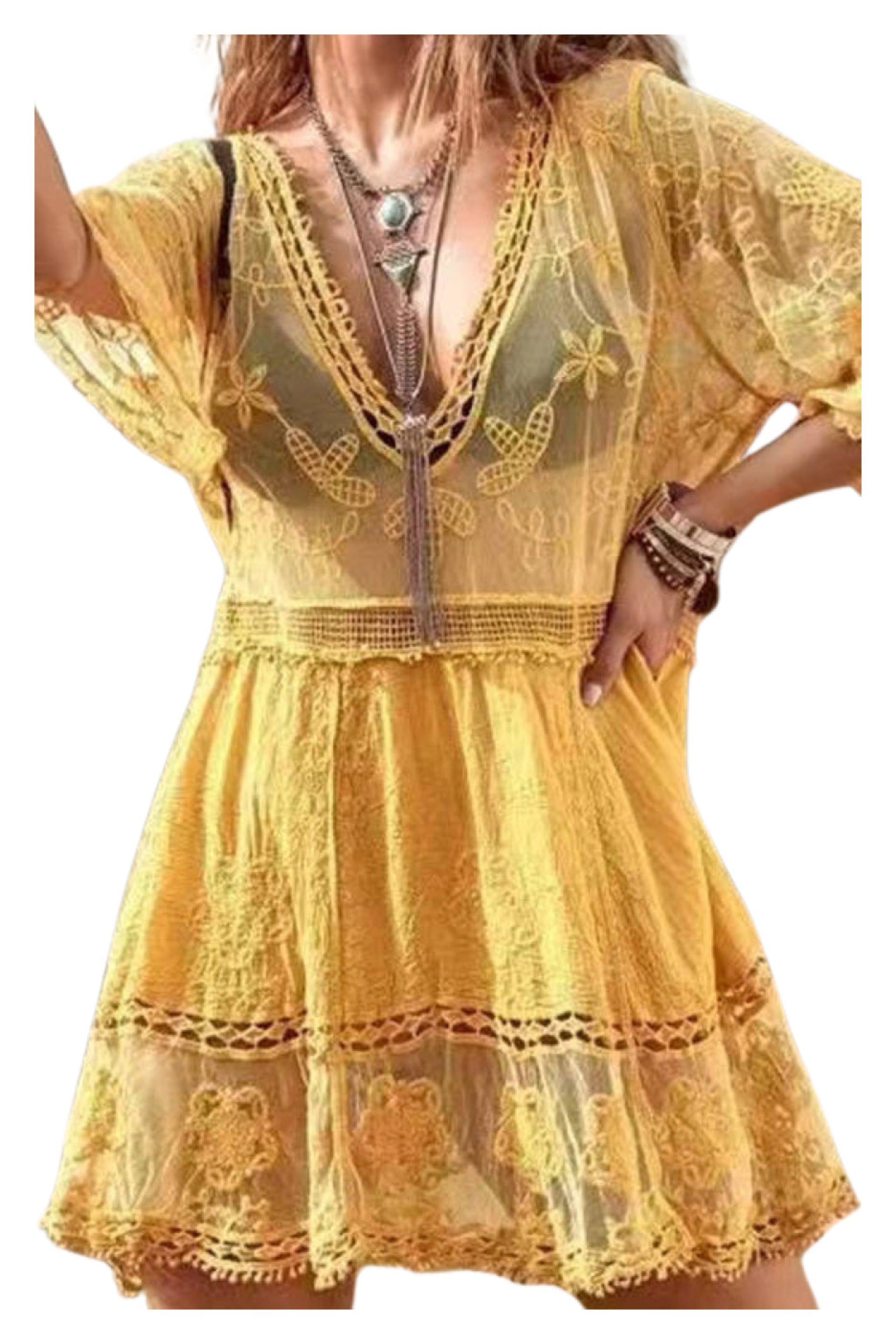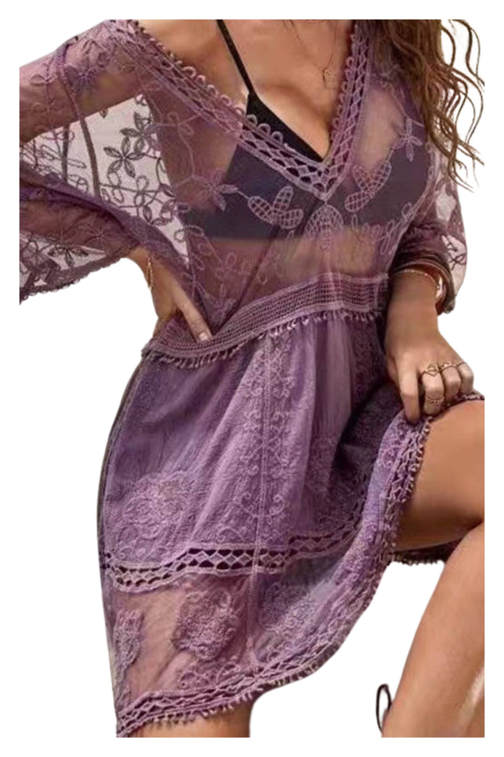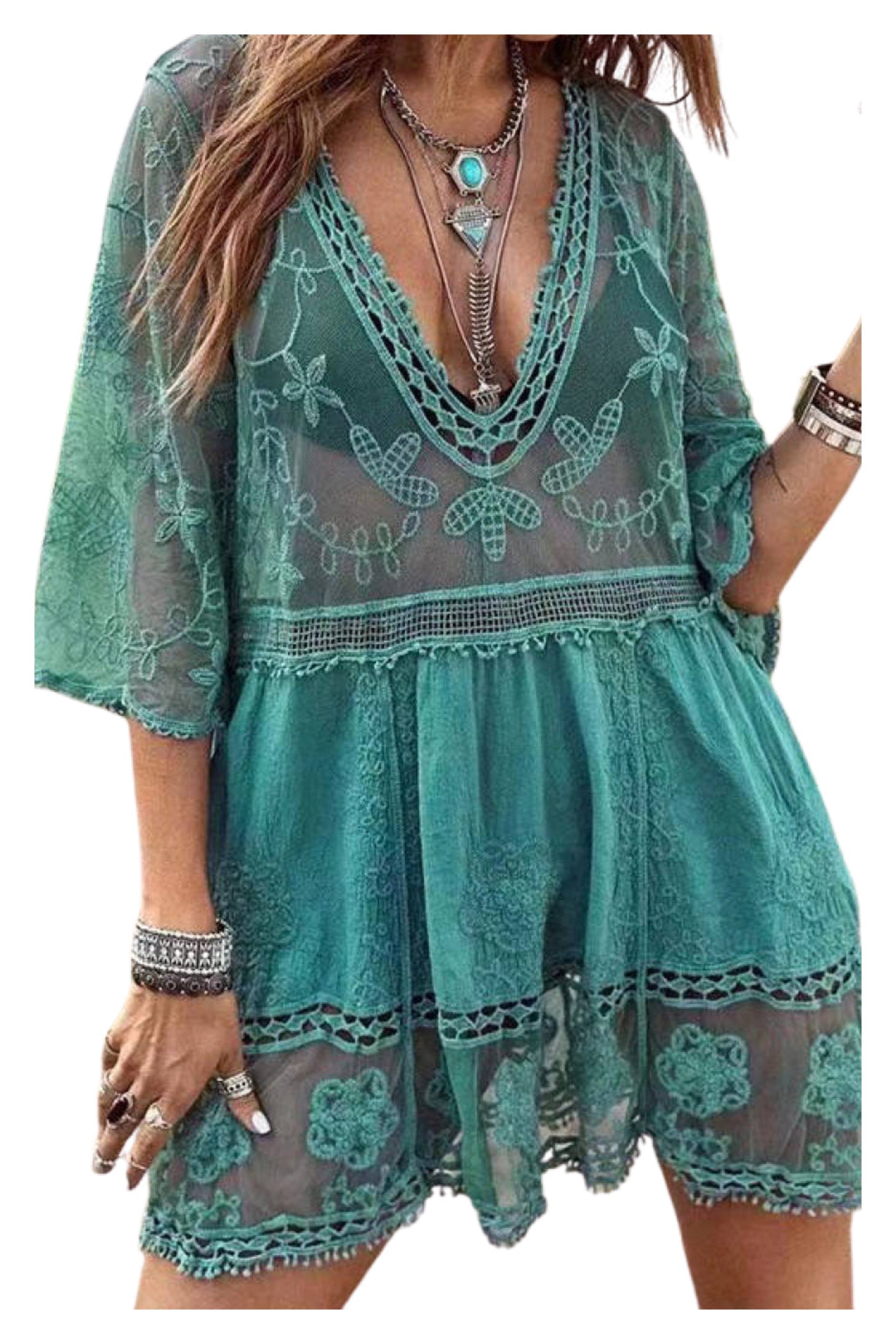 Lace Embroidered 3/4 Sleeve Tunic Cover Up