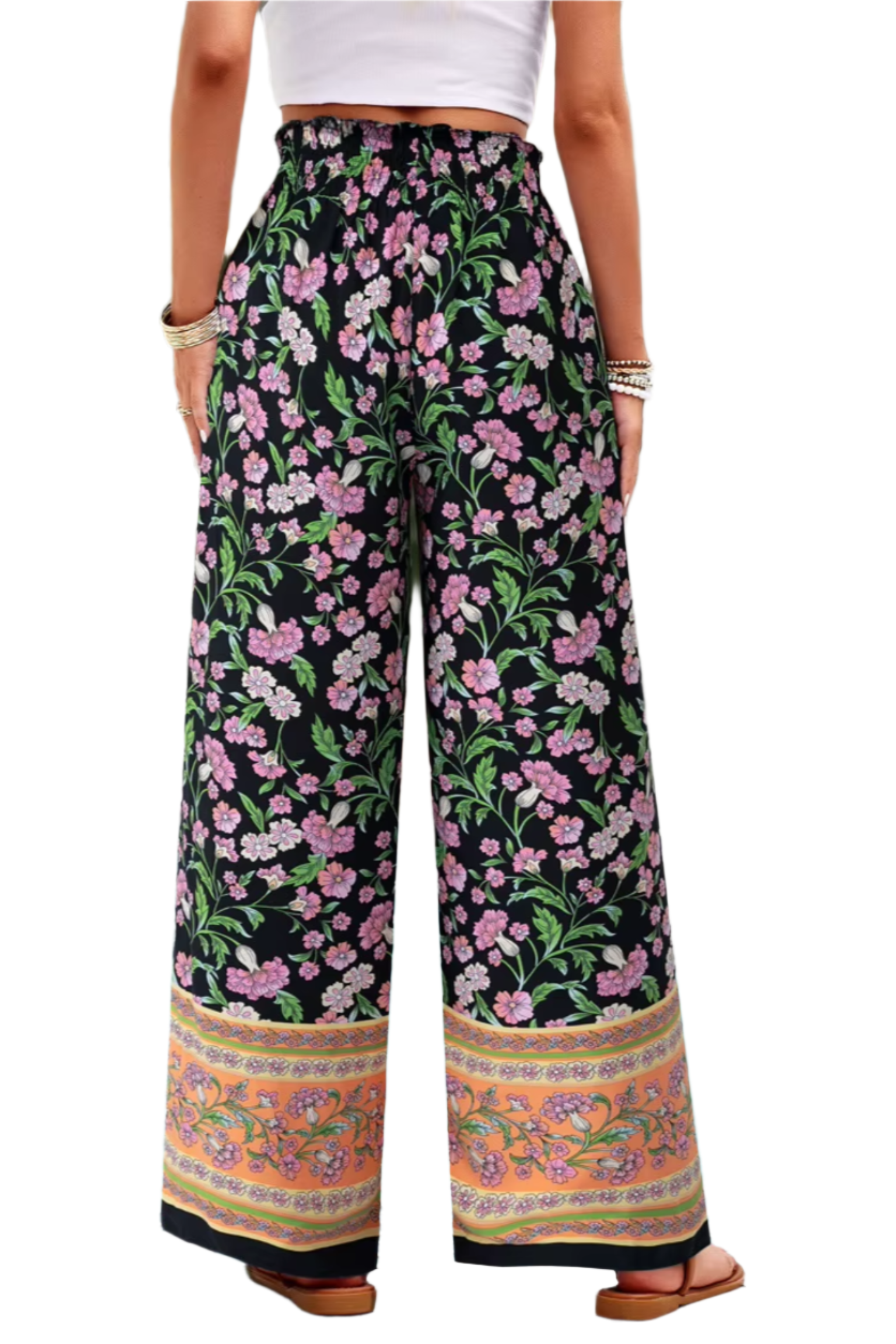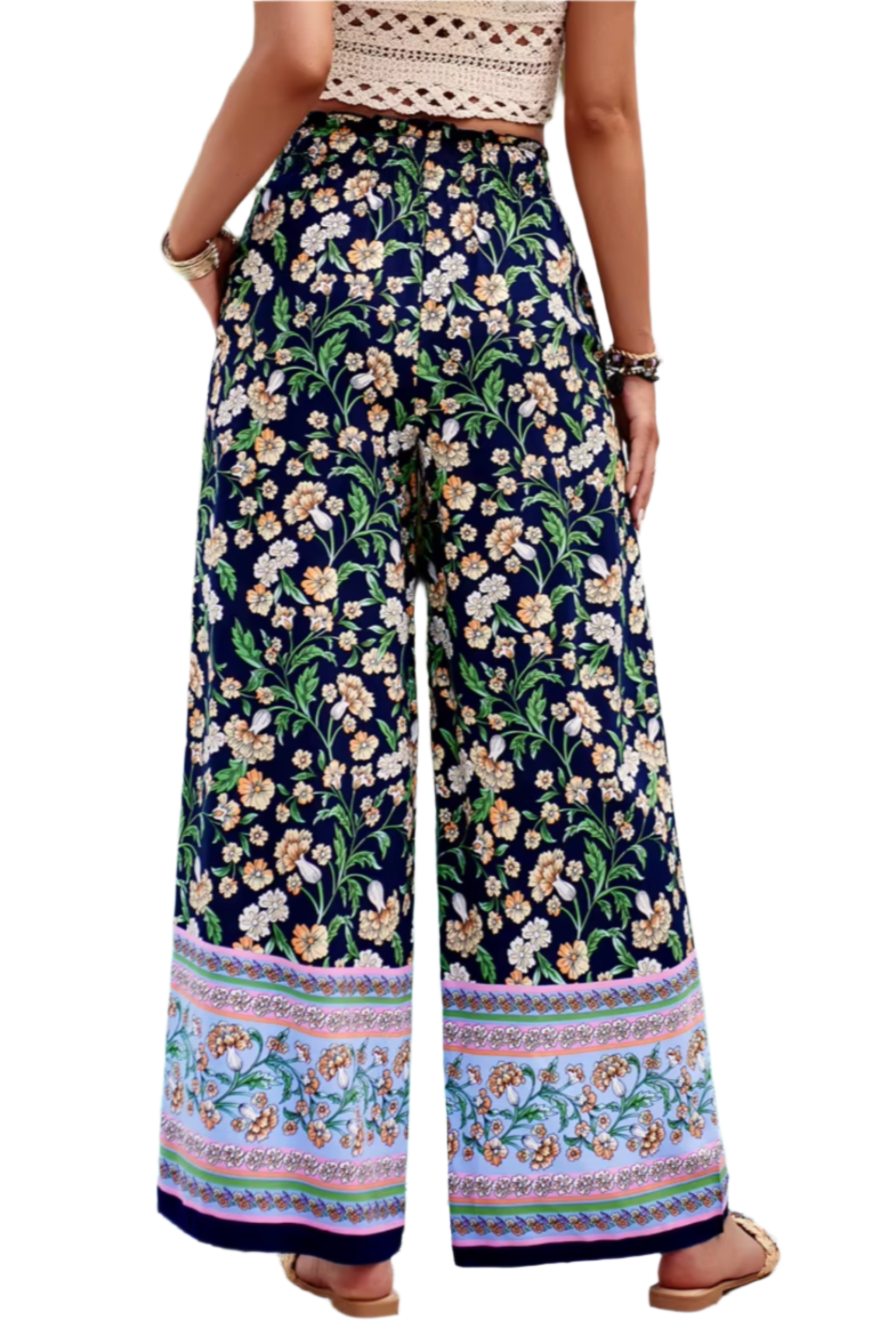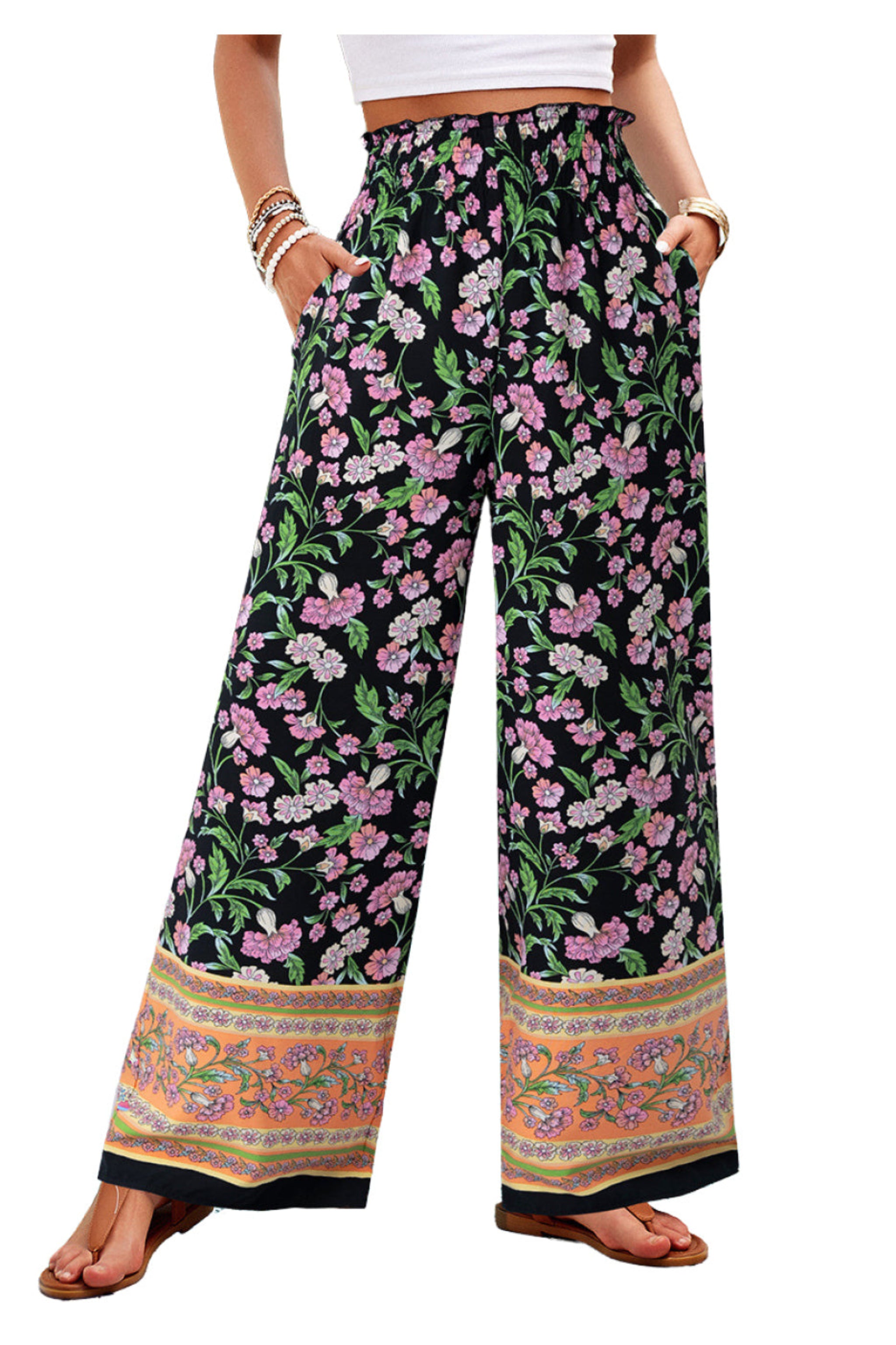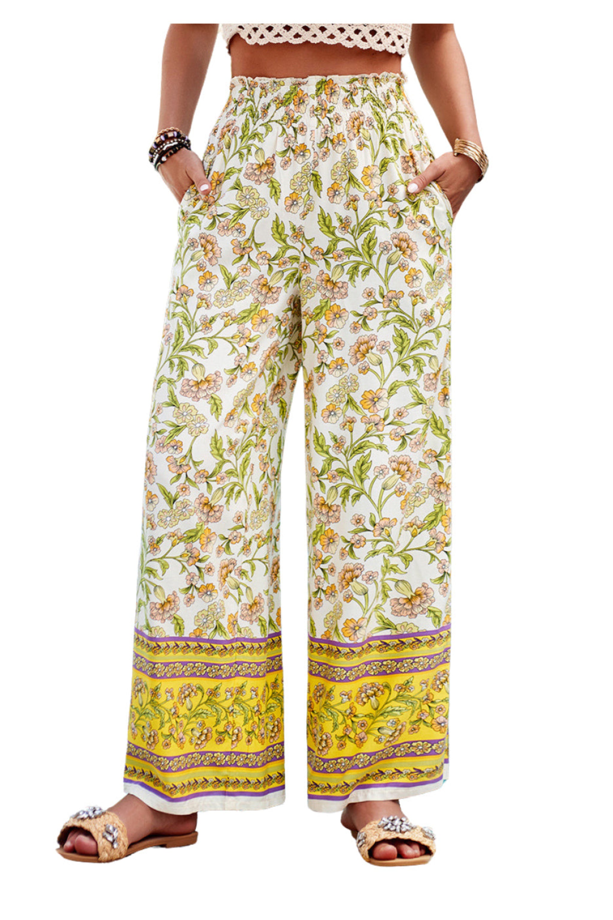Pantalon large palazzo à taille élastique et imprimé floral avec poches latérales